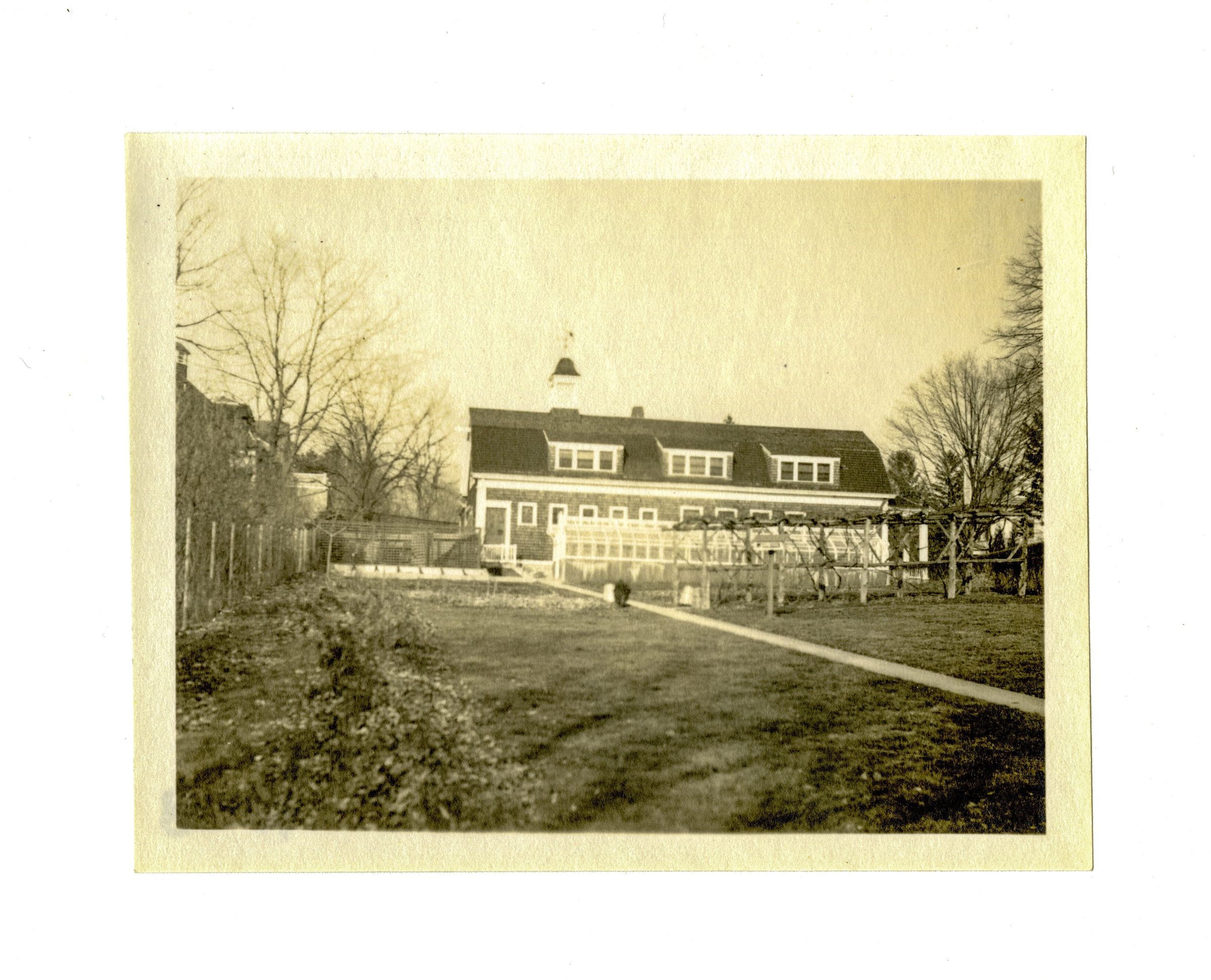 A view of the gardens and a greenhouse in front of a two story shingle building.Collection