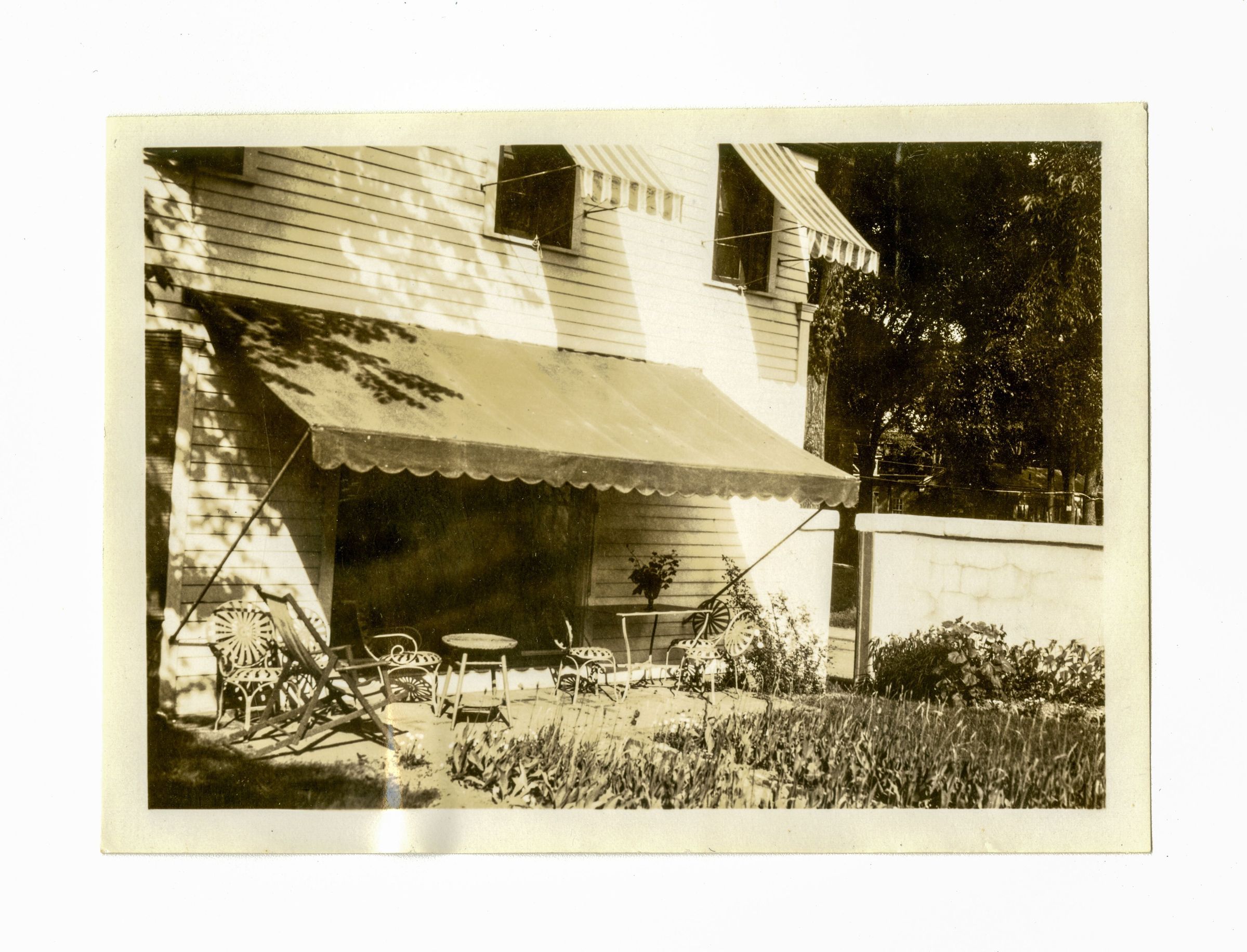 A view from the garden looking towards the house of an awning-covered patio.Collection