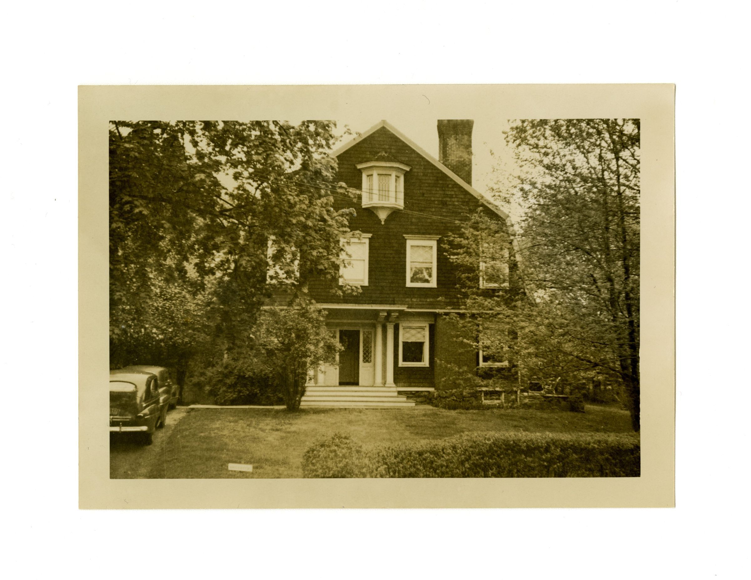 A three story shingle house with a bay window on the top floor.