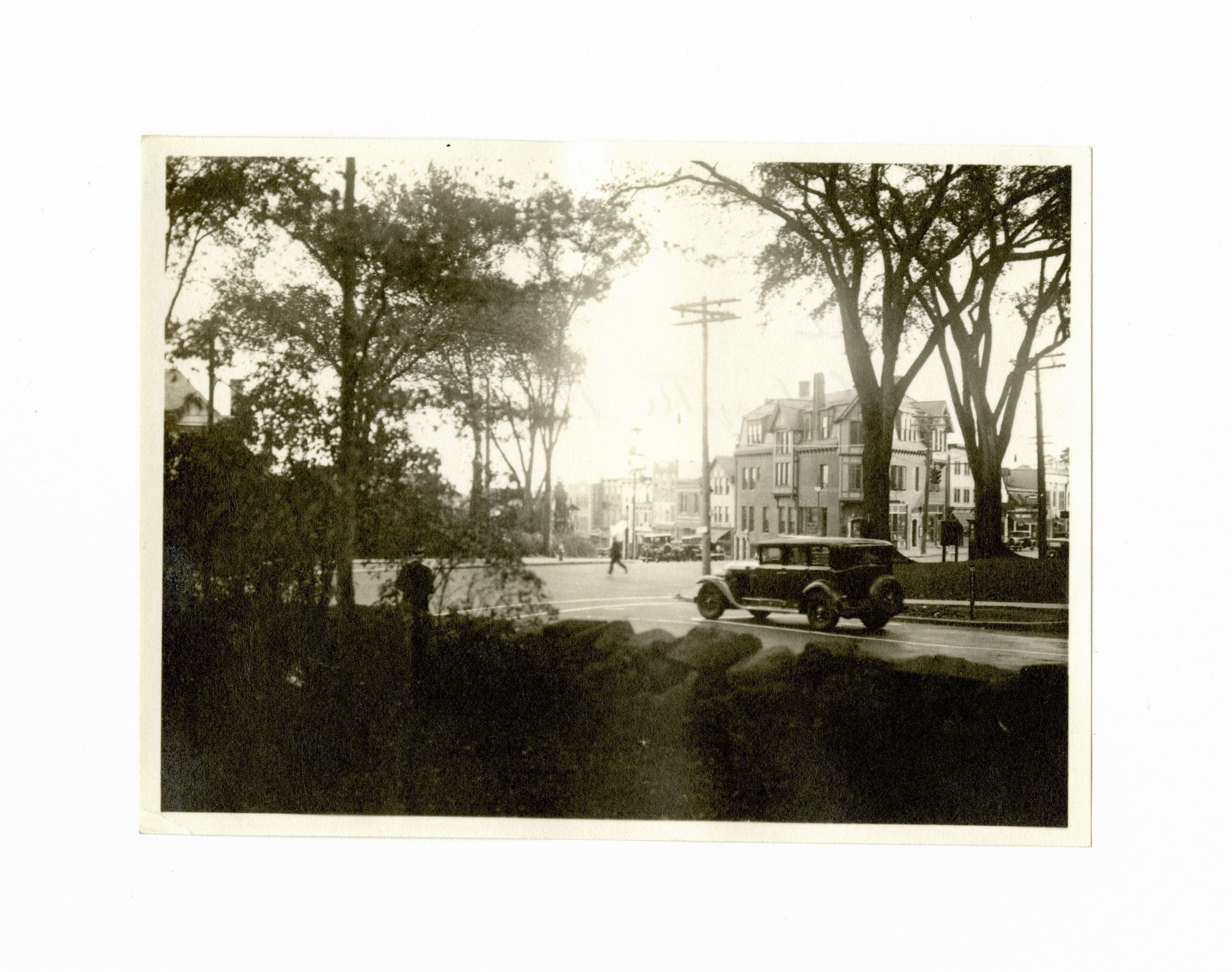 A view of the intersection of Lafayette Place and the Post Road looking towards the top of Greenwich Avenue with a car parked at the intersection.Collection