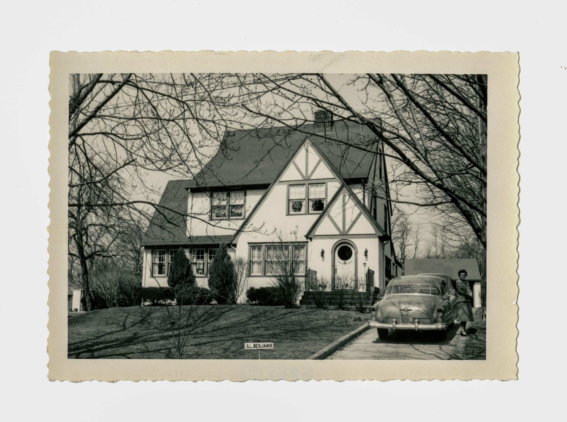 A three story house with two cars parked in its driveway. A woman is standing by the closer car.Collection