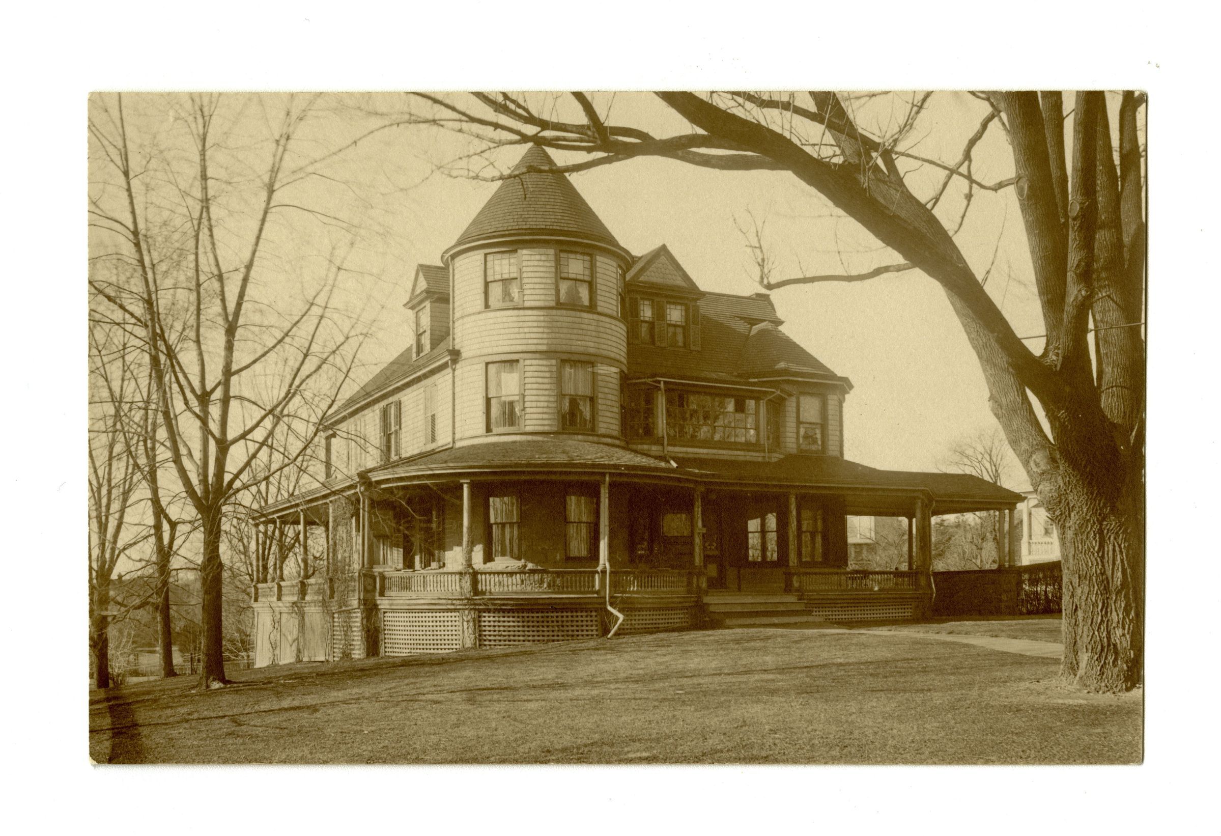 A three story shingle house with a circular tower and a wraparound porch viewed from its lawn.Collection
