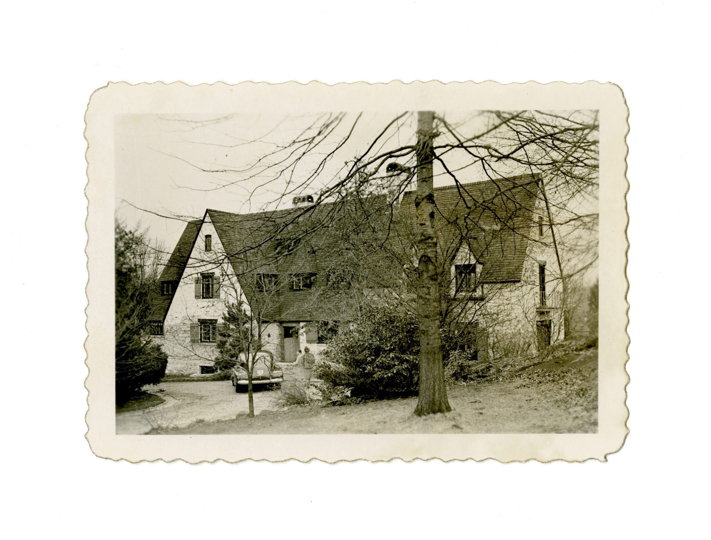 A three story home with a car parked in the driveway and two women next to the car.Collection