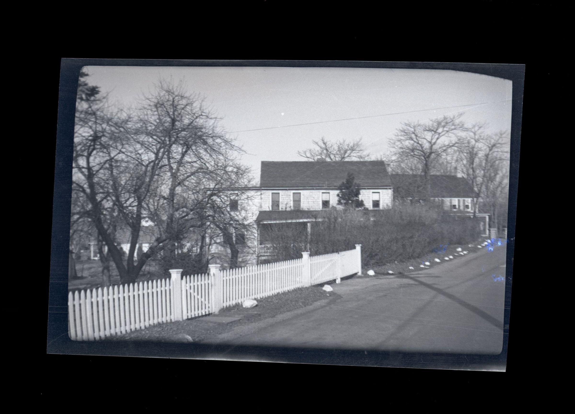 The side of a two story shingle house viewed from the street. A neighboring house's picket fence is on the left side and center of the image.Collection