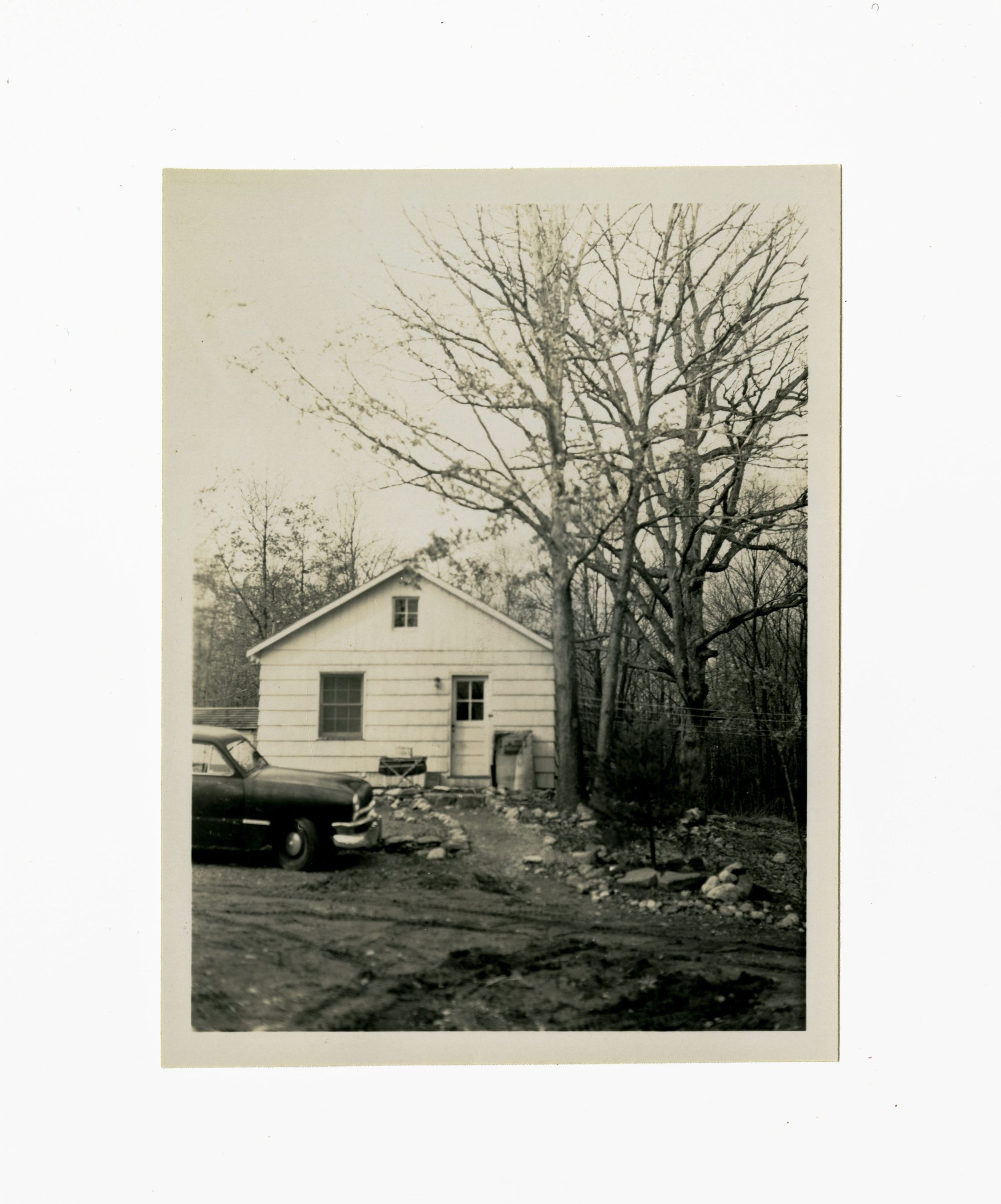A small clapboard house with a car parked in front of it.