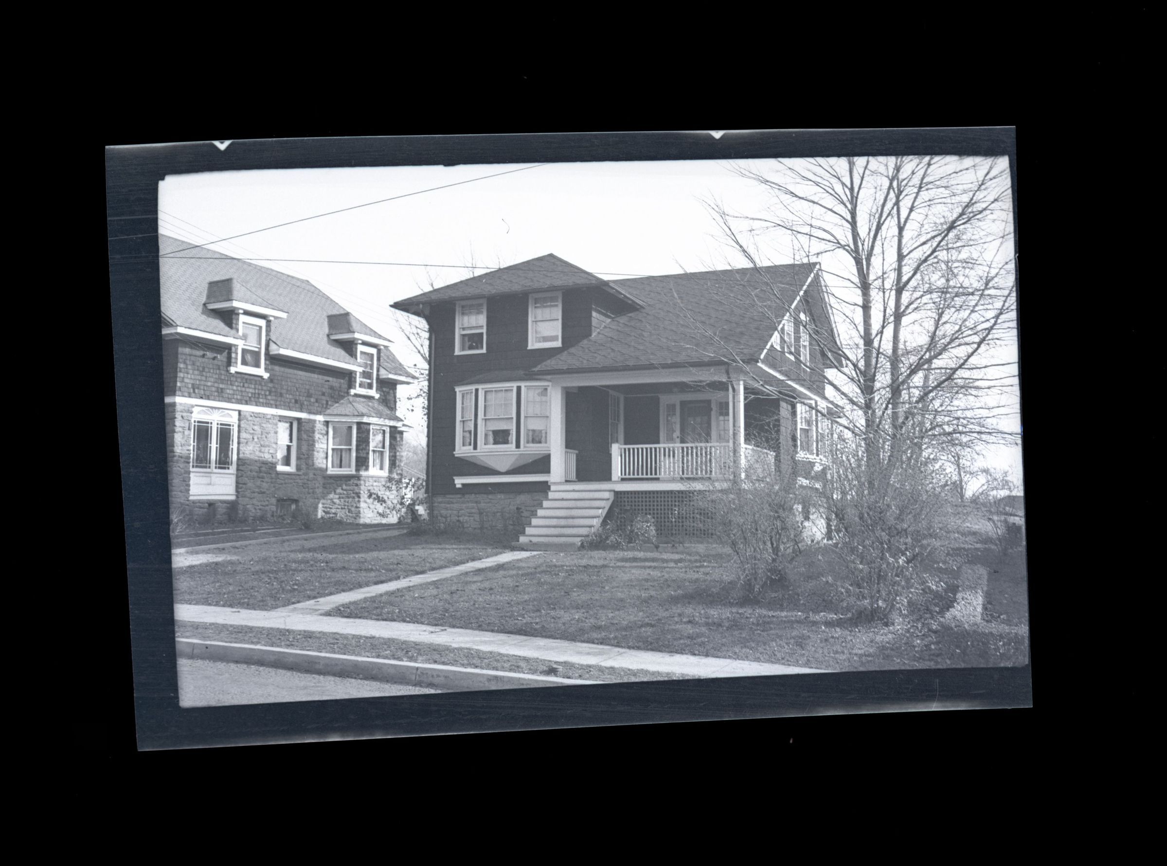A two story home with steps leading up to its porch and a bay window on the left of the image.
