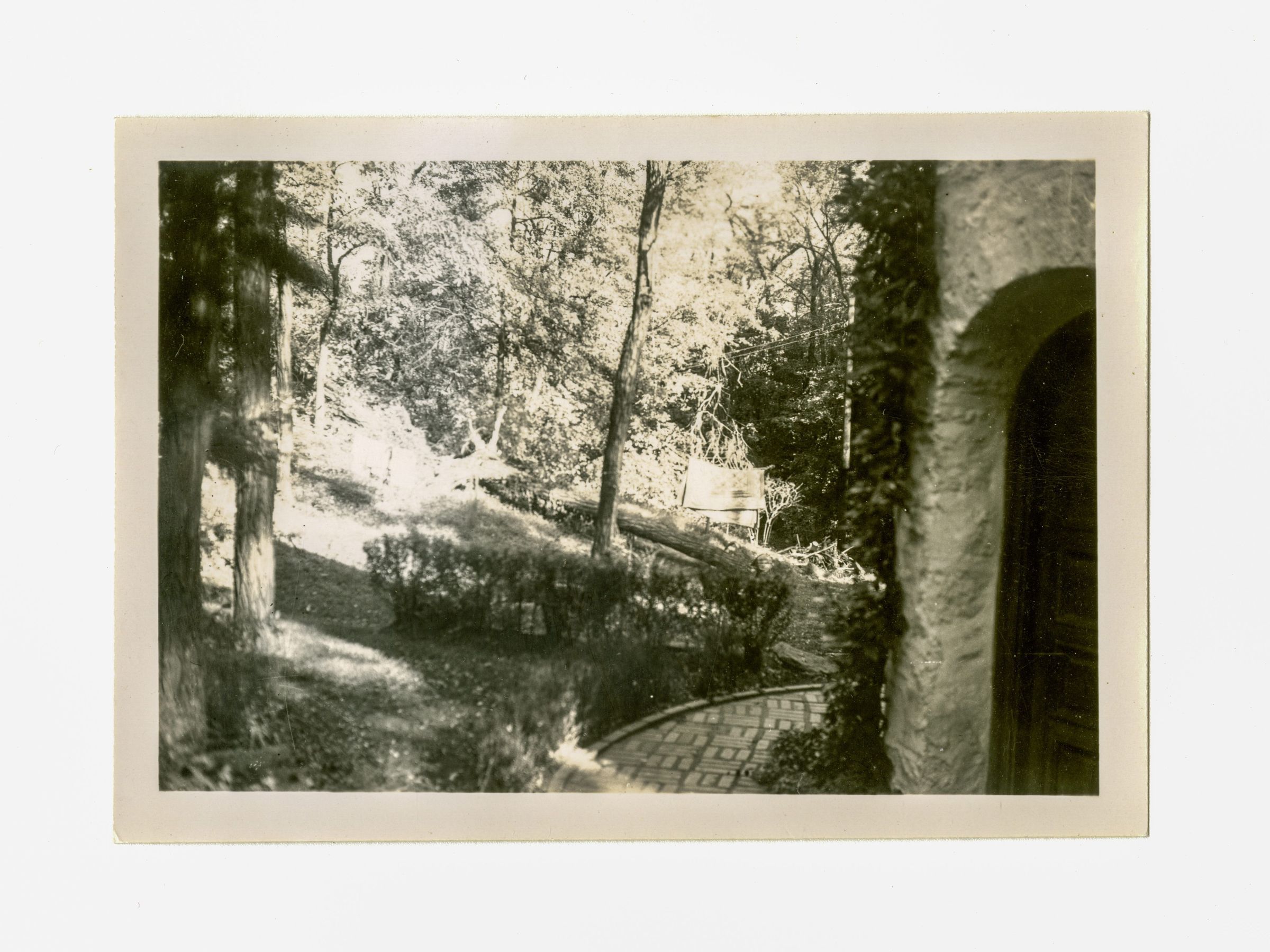 A view of part of the grounds of the estate with drying laundry hanging in the background and the doorway of a stone building taking up the right side of the image.Collection