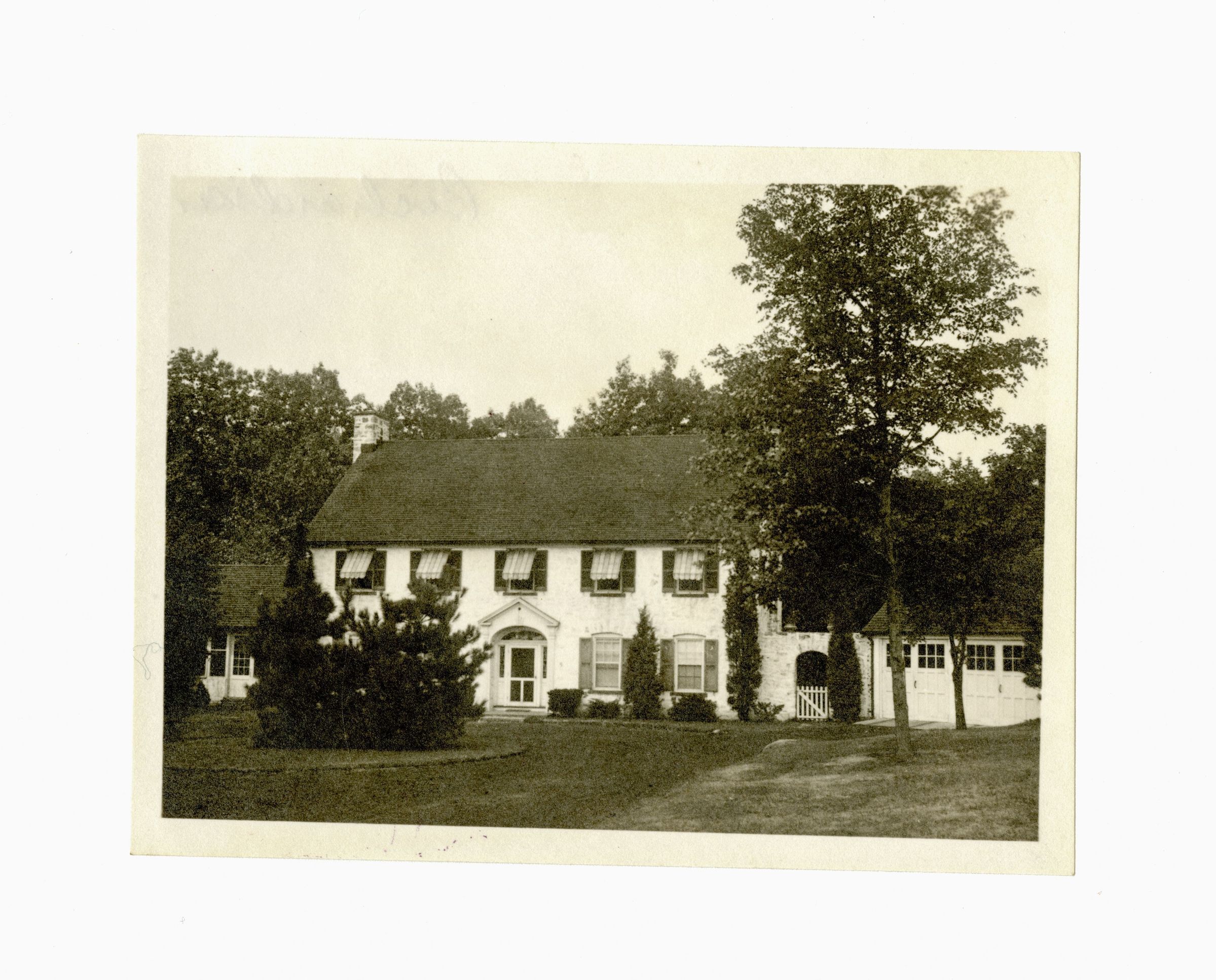 A stone house with small awnings over its second floor windows and a two door garage on the rights side of the image as seen from its driveway.Collection