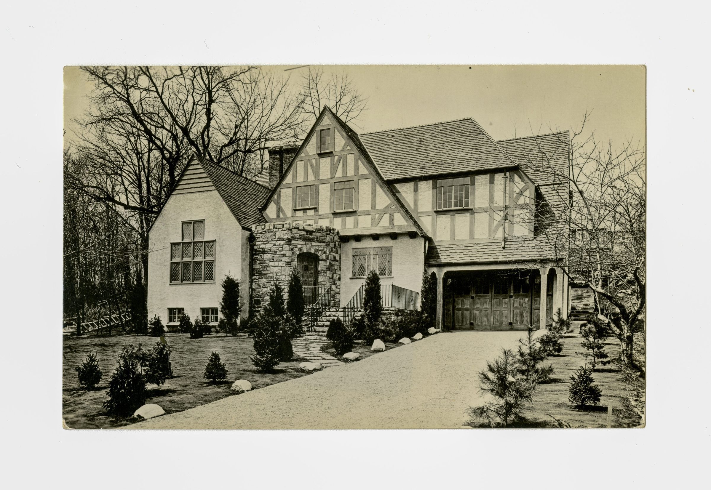 The front of an English style house with a garage, viewed from the end of its driveway.Collection