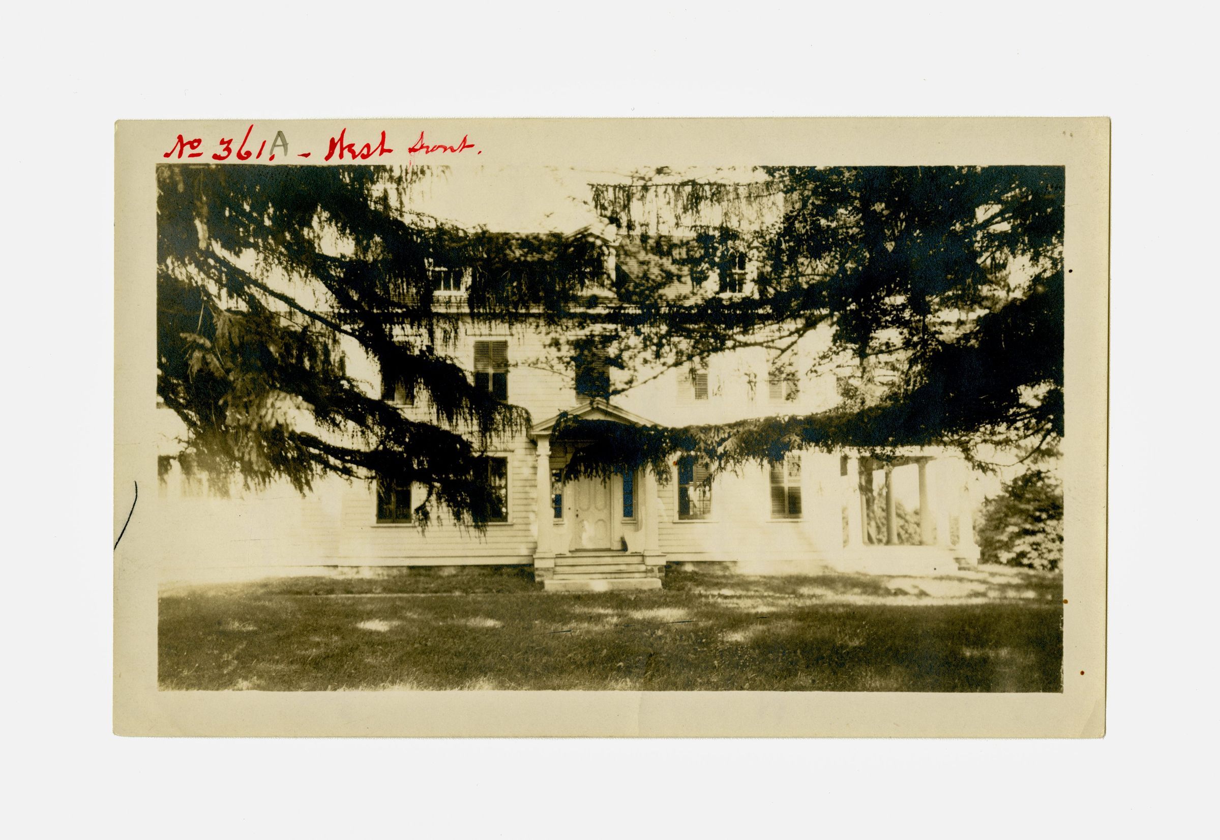 A view of a house with a portico over its entrance.