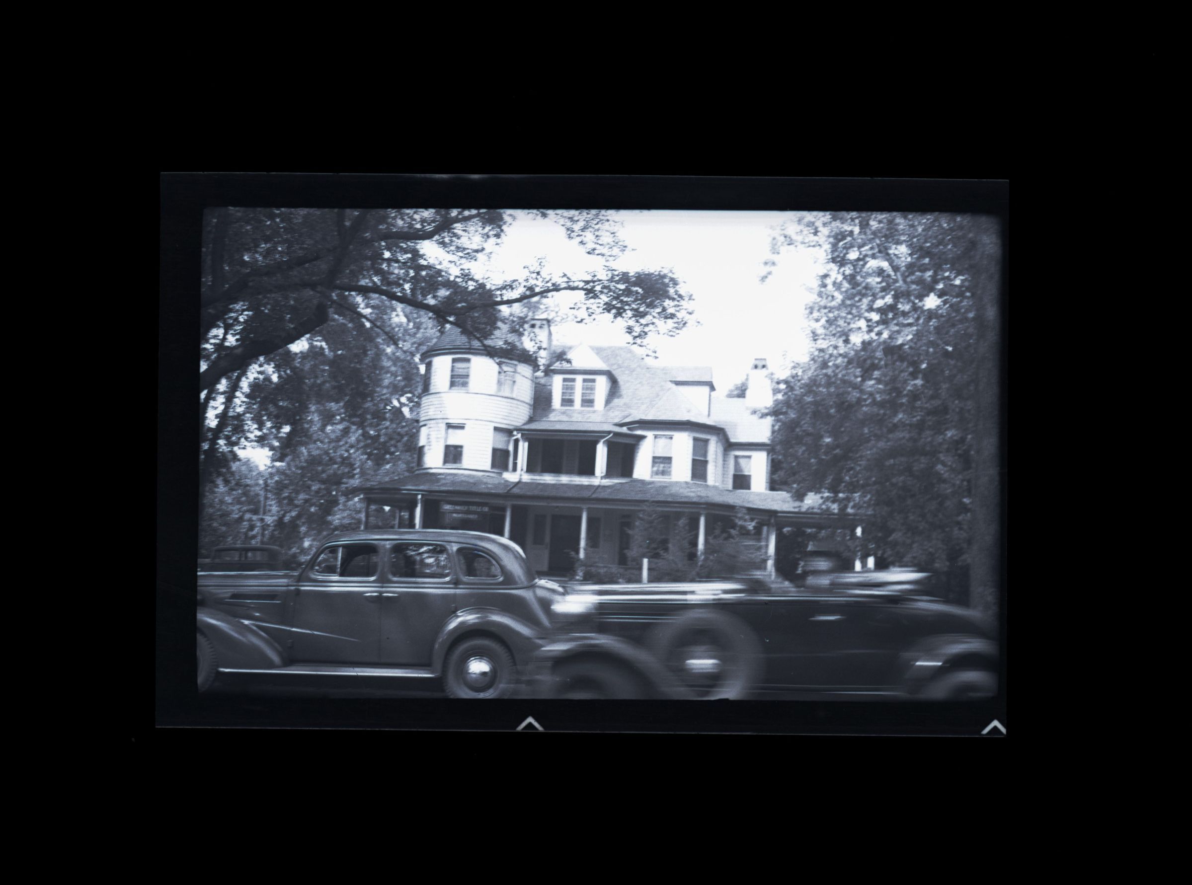 A three story house with a circular tower and wraparound porch viewed from the street where a car is parked and another is driving past.Collection