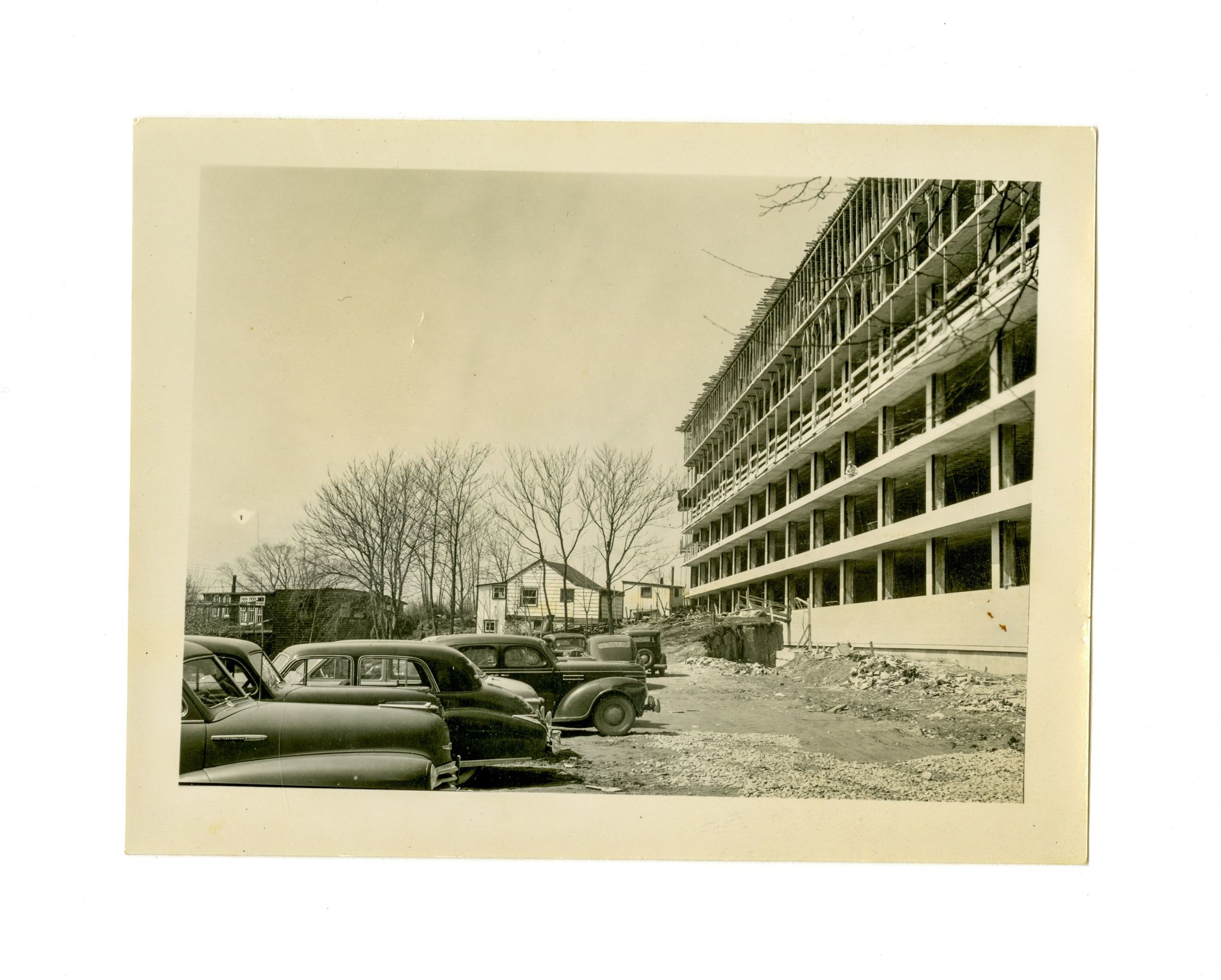 A wing of Greenwich Hospital under construction at some point in the 1940s. A number of cars are parked near the building under construction.Collection
