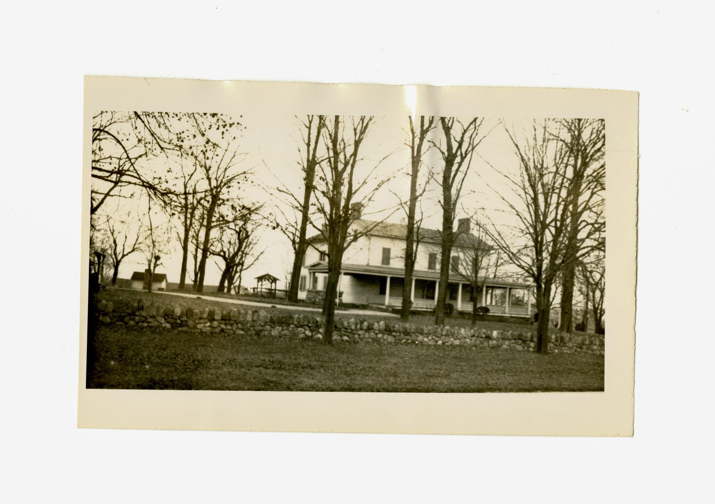 A three story home with a full length porch with a stone wall in its front lawn.Collection