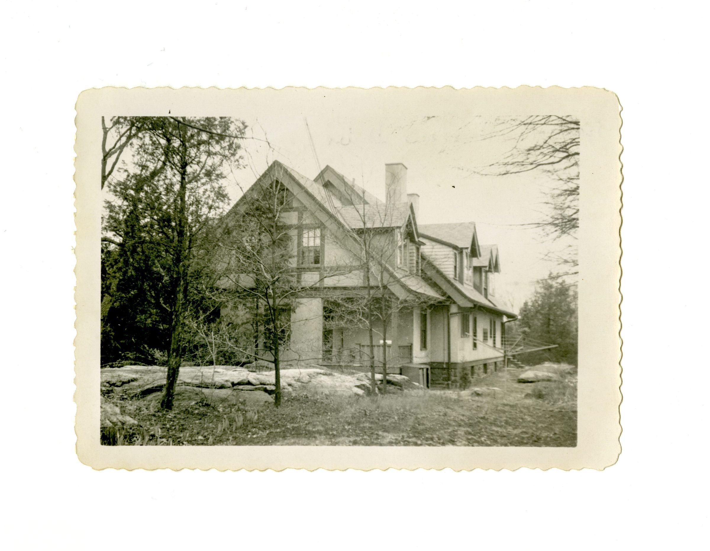 A view of the side and back of a three story home with several dormers.