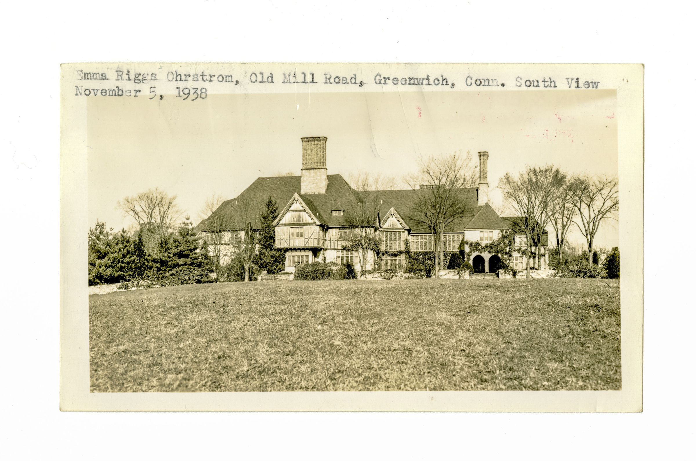 The back of a large Tudor-style house as seen looking south from its lawn.