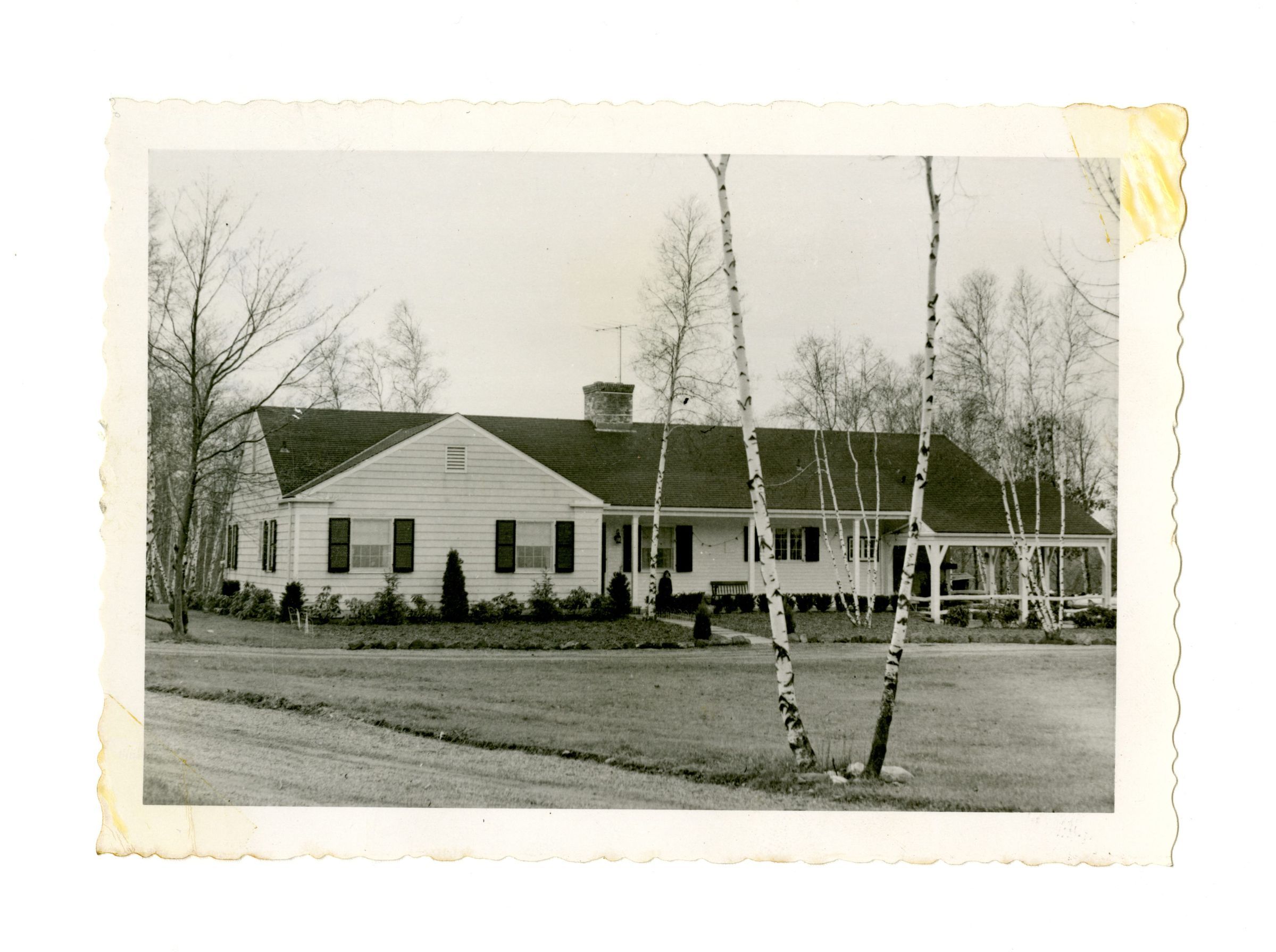A single story house and its front lawn with a number of birch trees growing around the house and its lawn.Collection