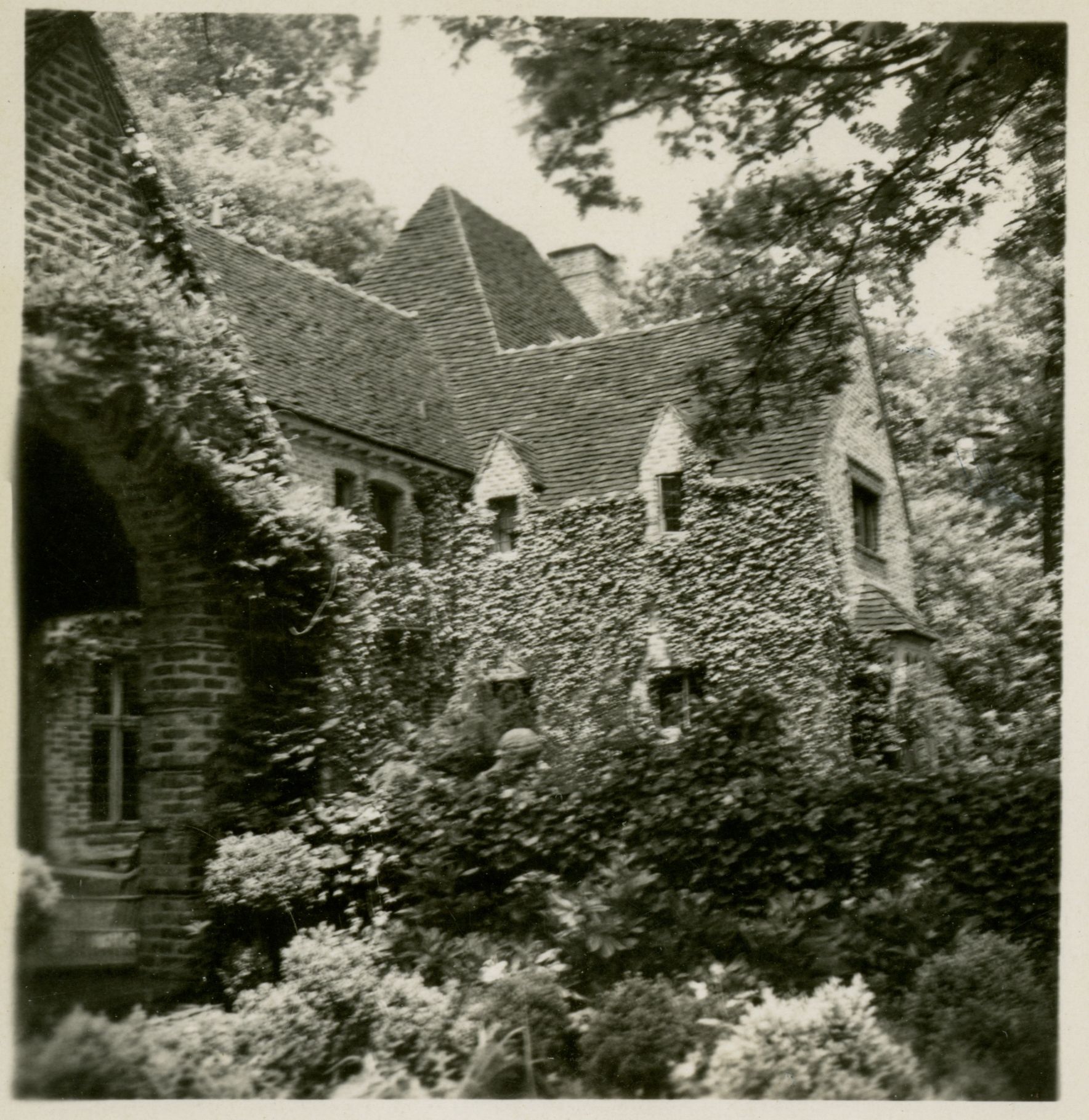 A view of part of a three story brick house and its garden. Parts of the house are covered in ivy.Collection