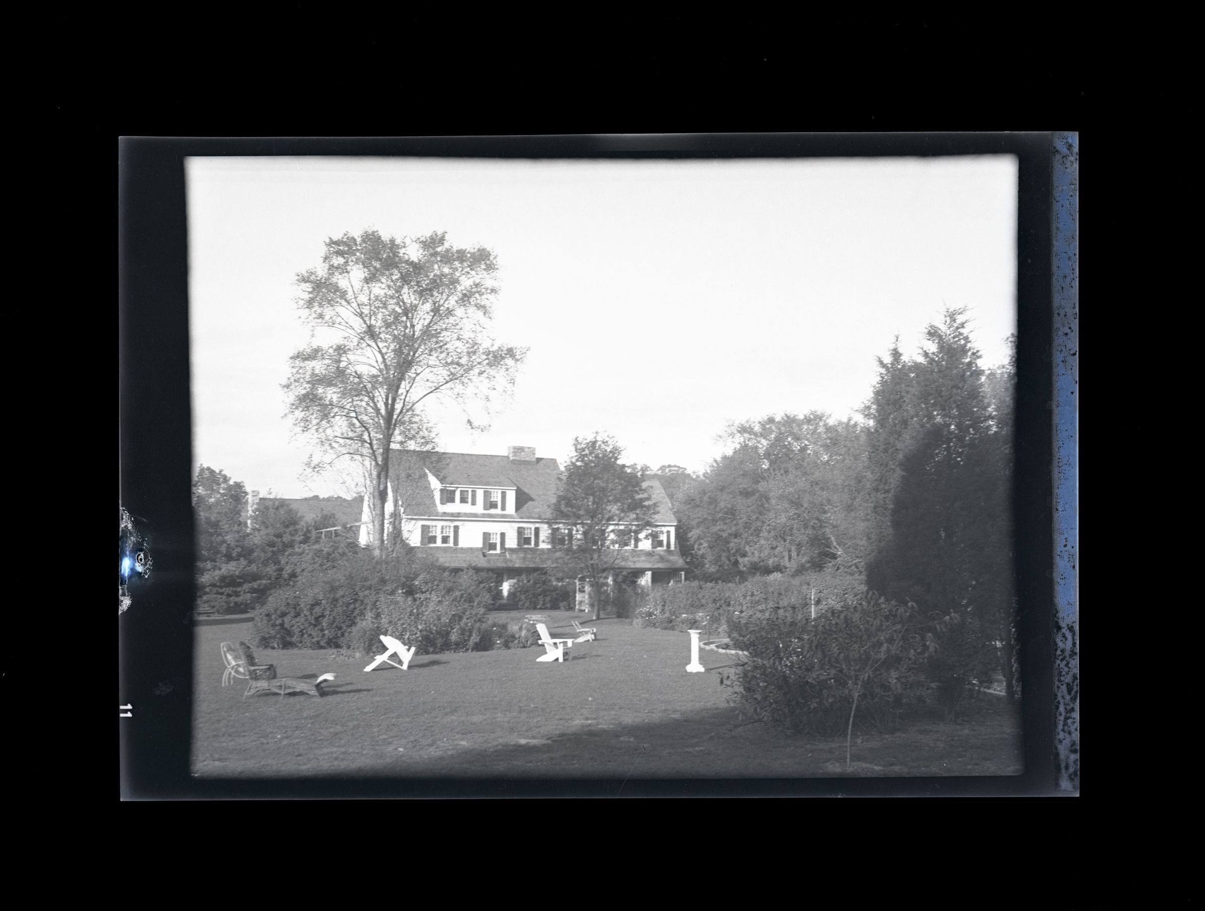 A view of the back of a three story house and part of its lawn with several lawn chairs.Collection