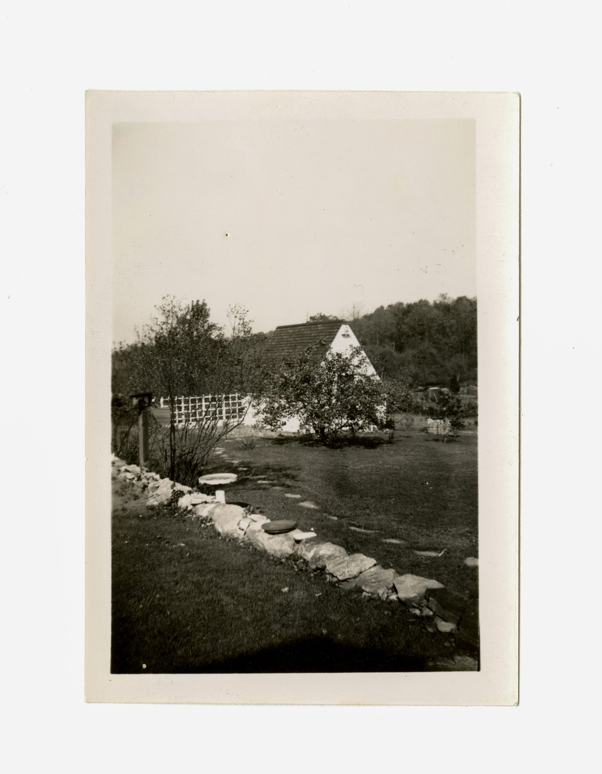 The rear of a home and its lawn where a small rock wall, birdbath, and stone path are all visible.Collection
