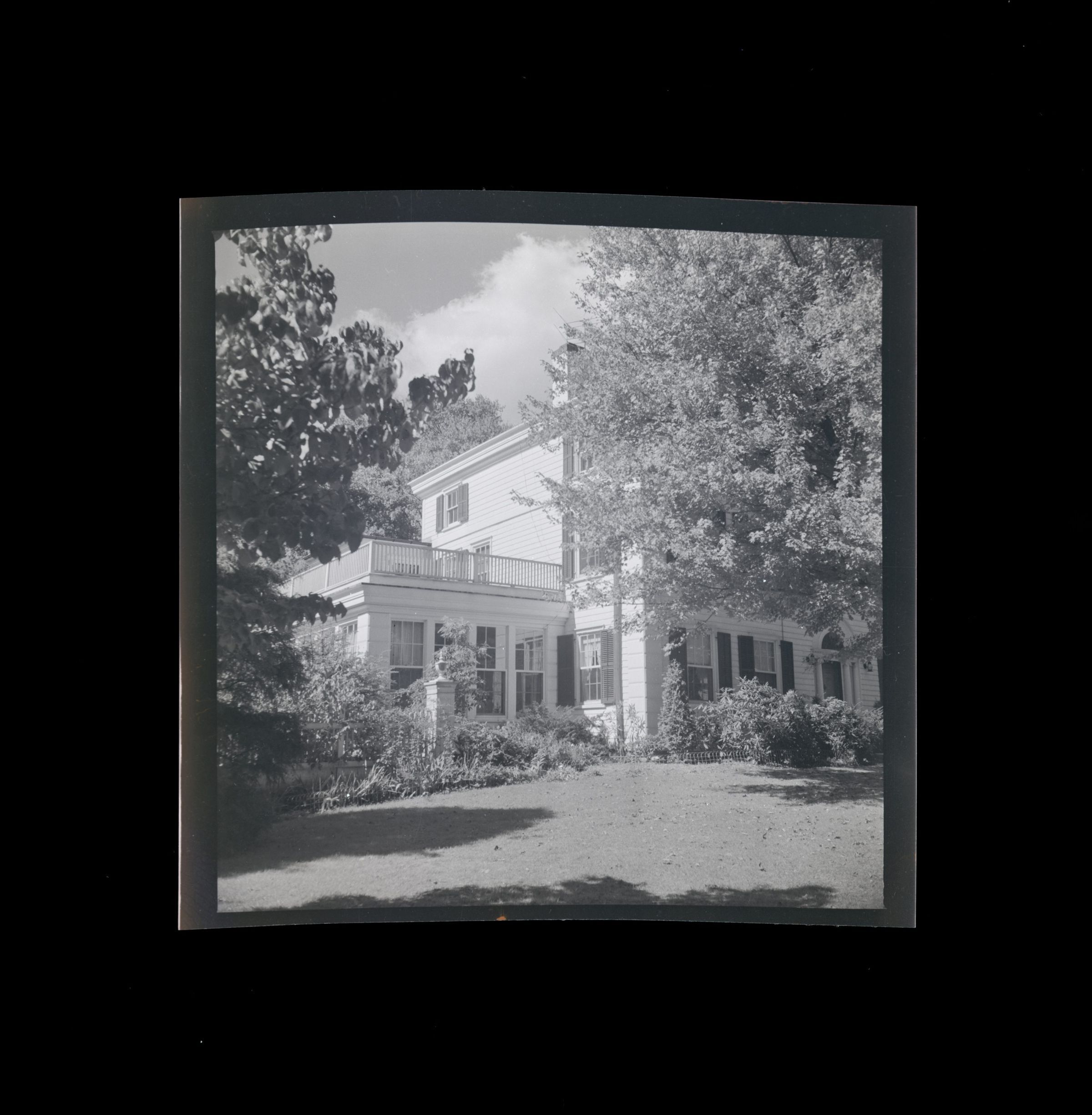 A view of the side of a four story house with a single story wing on the left of the image and part of its garden.Collection