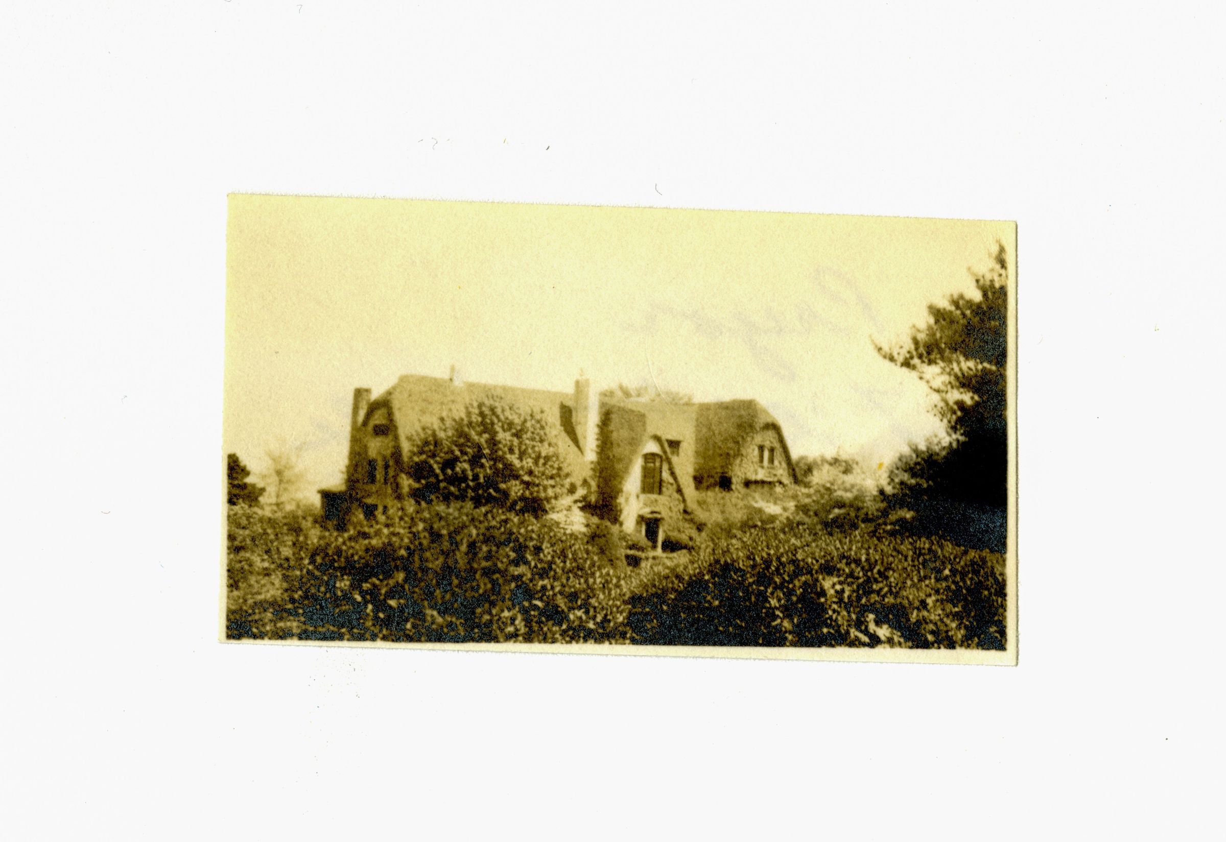 A view of a home, largely obscured bushes.