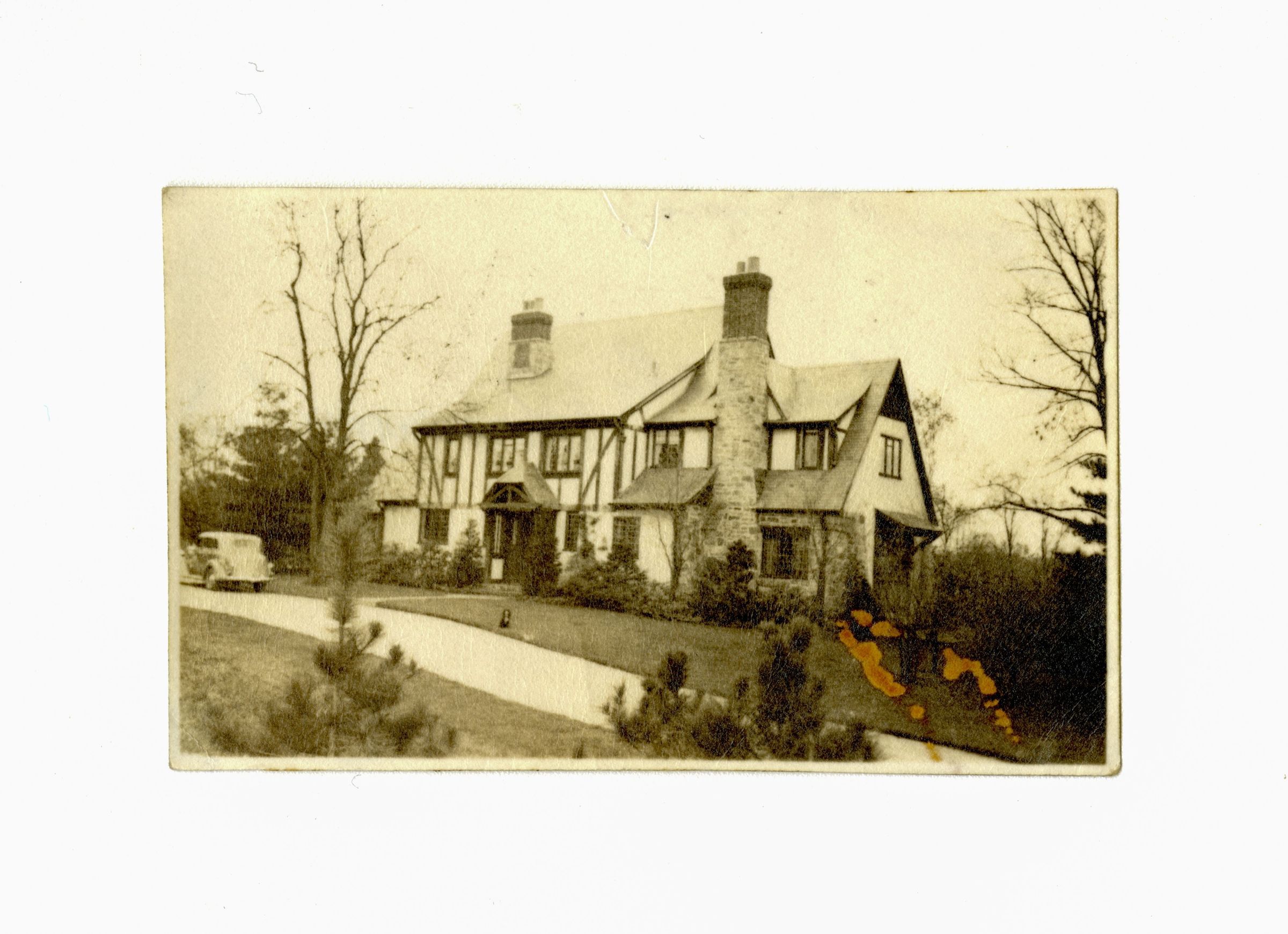 An English-style house and its front lawn with a car parked on the road in the left of the image.Collection