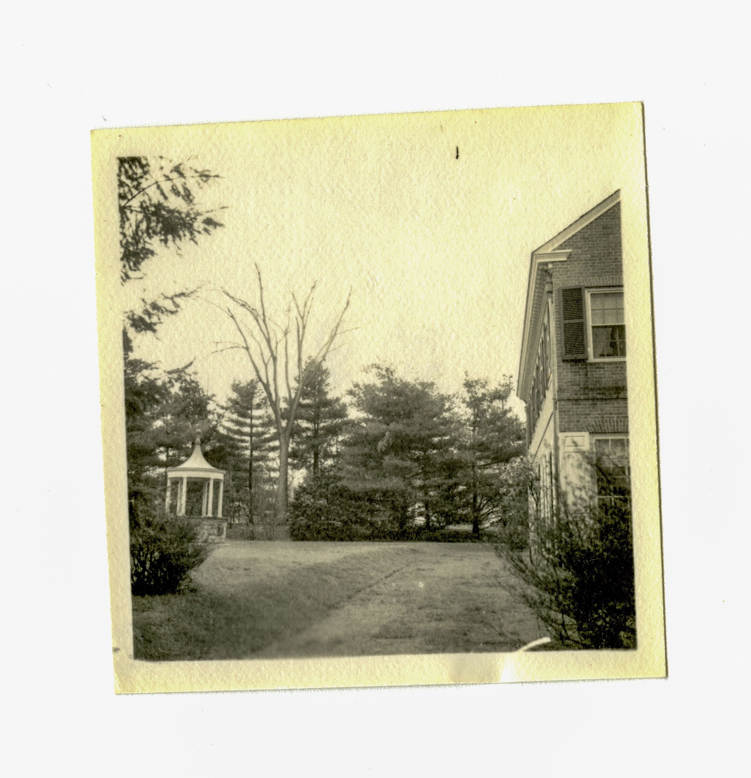 A view of the side of a two story brick house and its lawn where a small gazebo stands on the left of the image.Collection