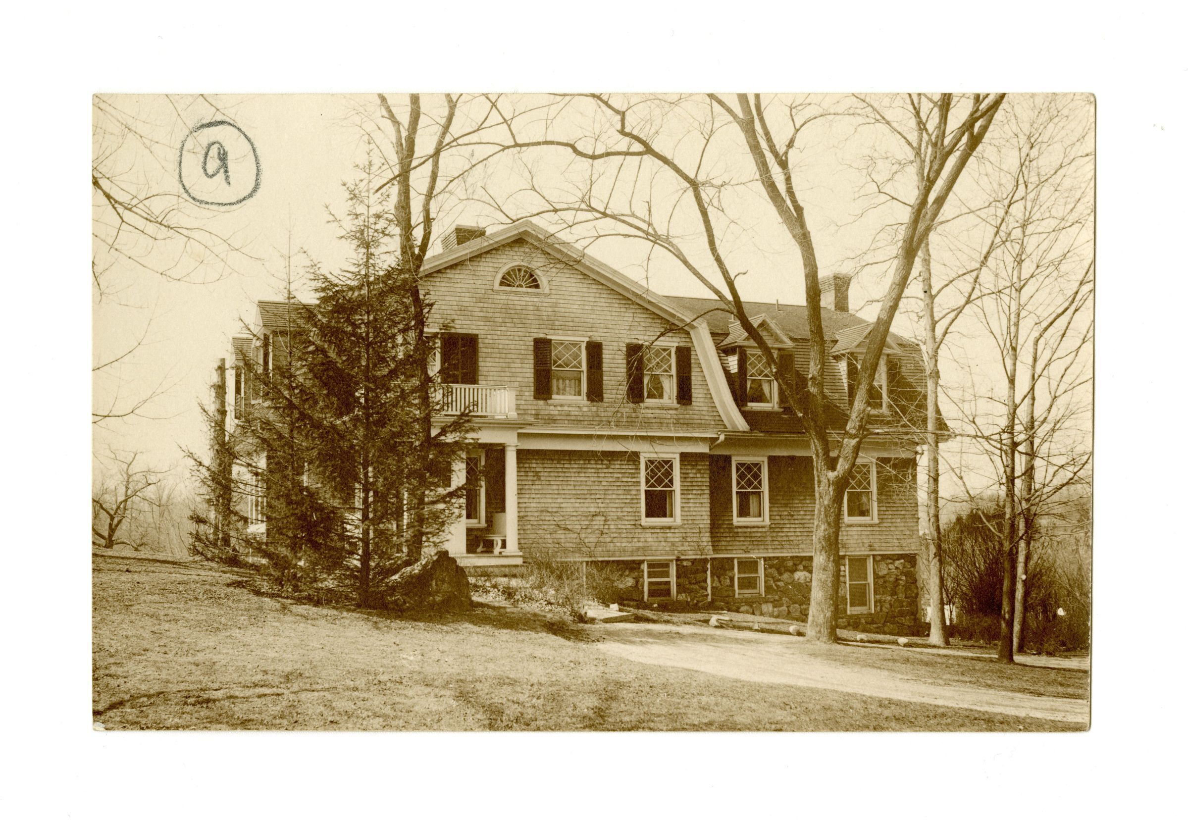 A three story shingle house with a gambrel-style roof.