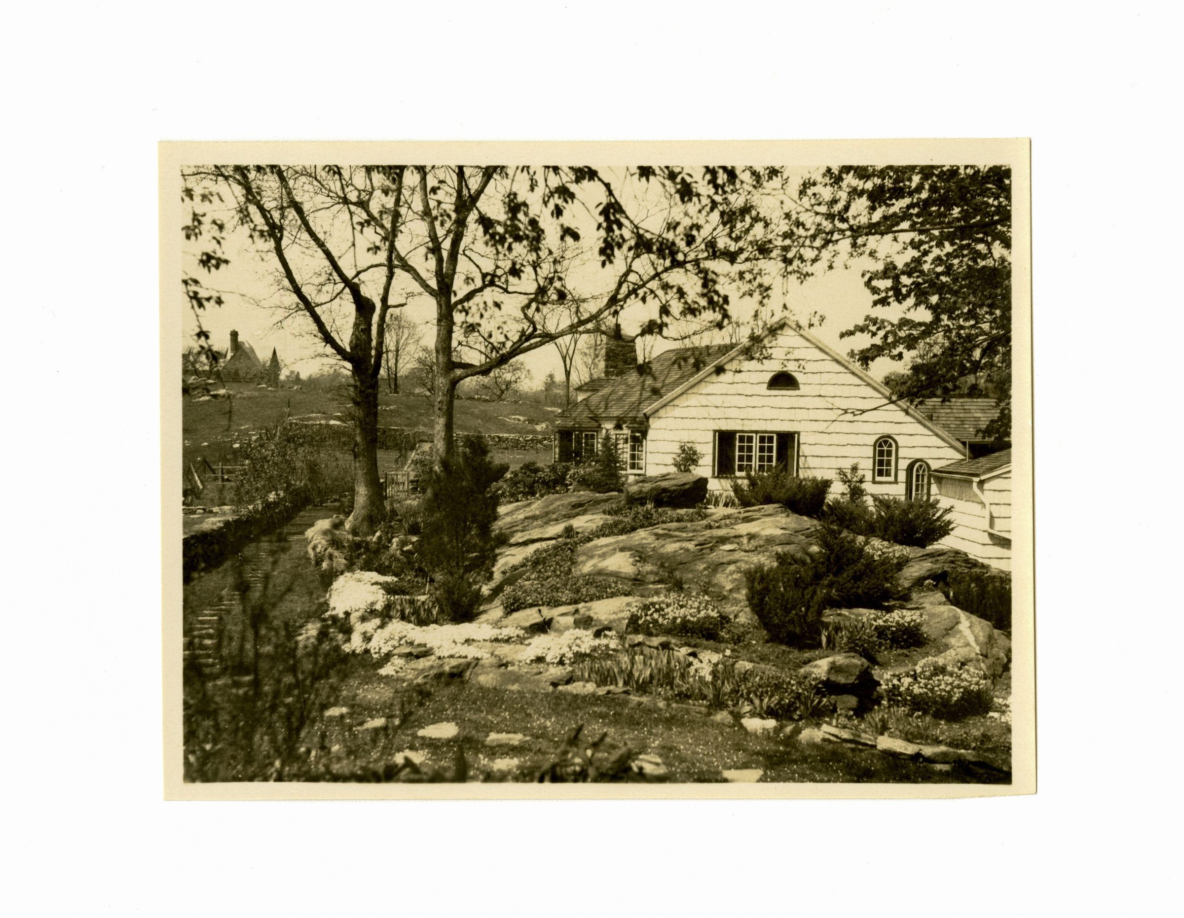 A portion of the house and a rocky outcrop covered in shrubs and flowers in the garden.