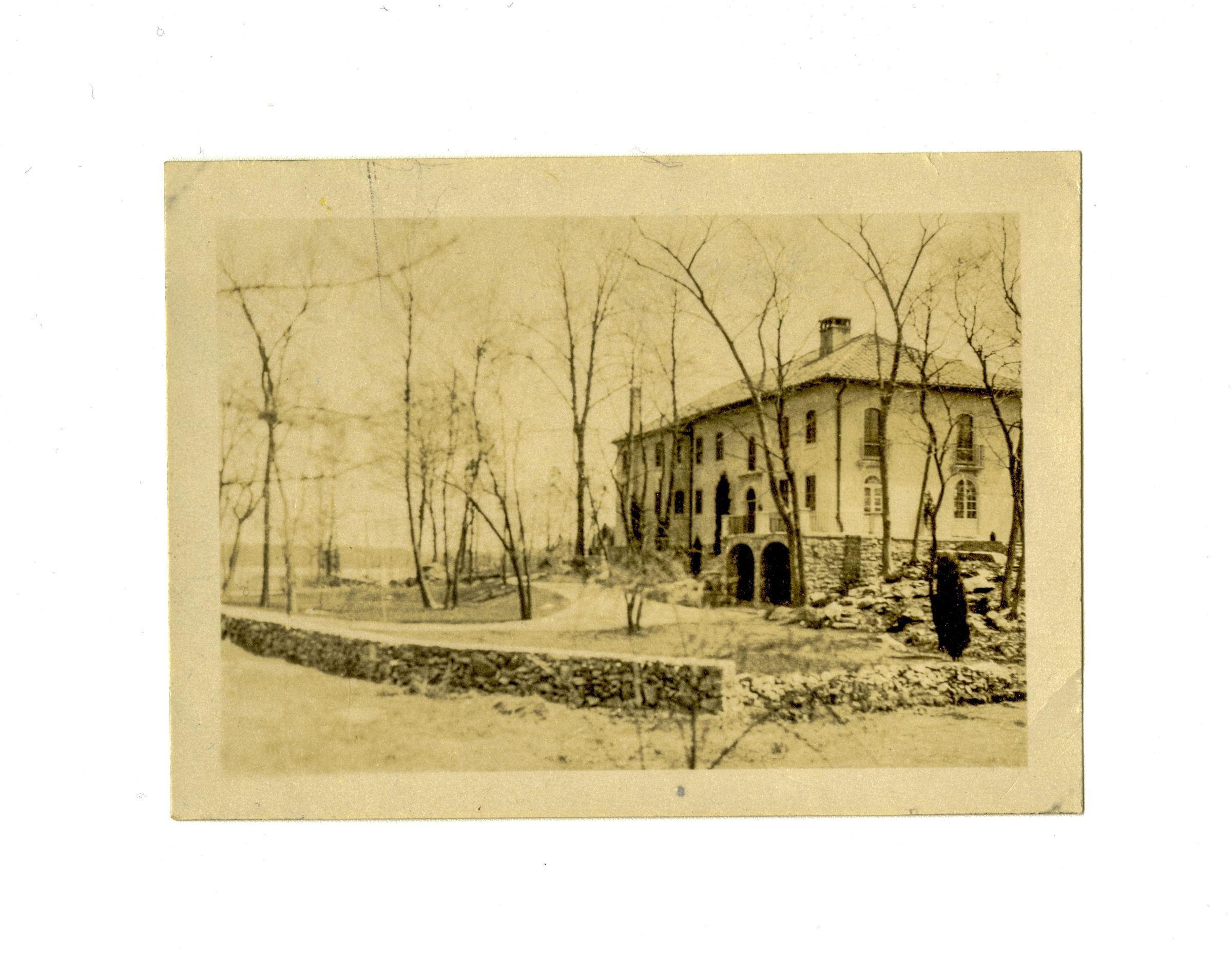 A Mediterranean style home with a tile roof and a two door garage built into the ground under the house.Collection