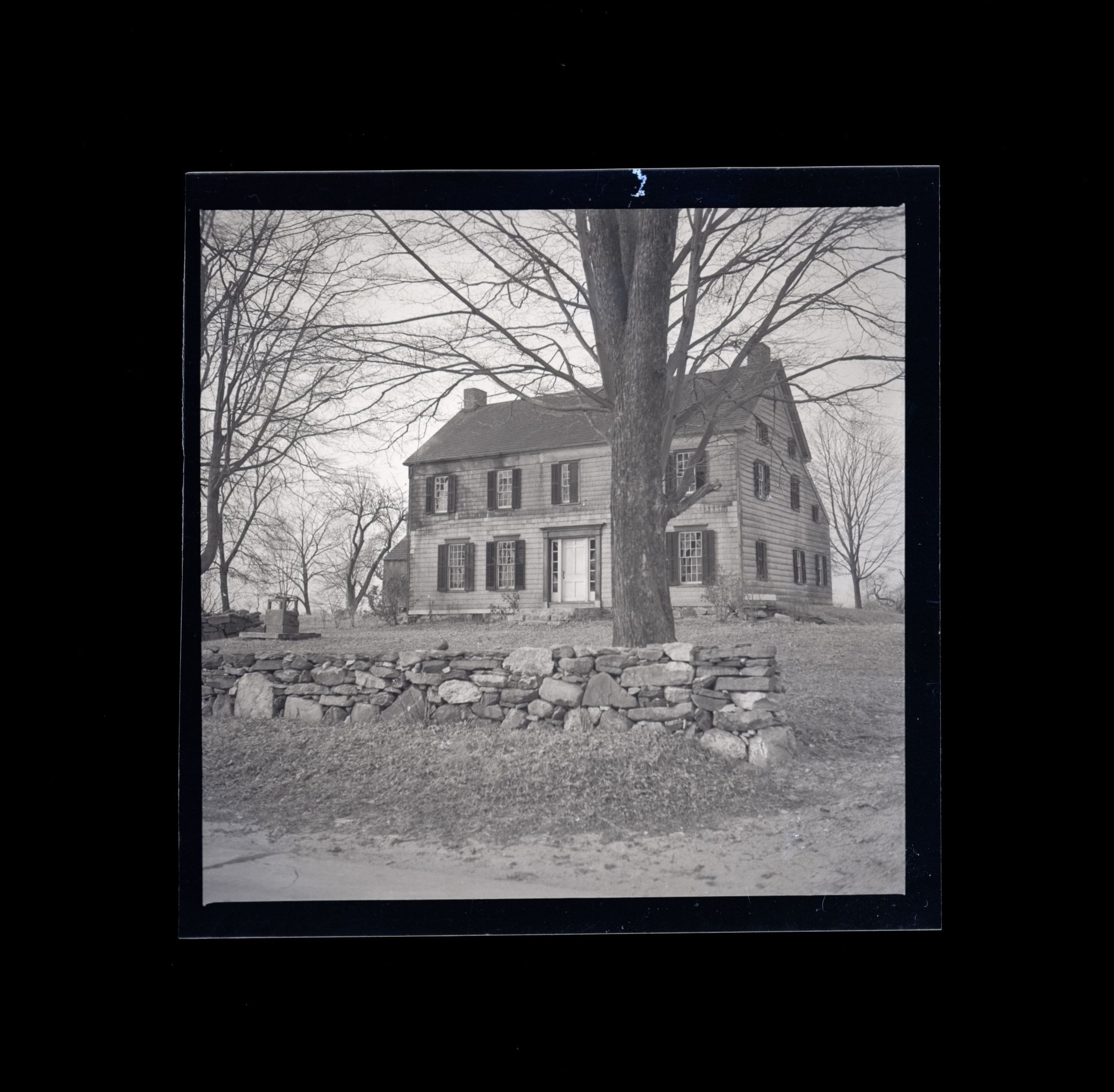 The front of a three story saltbox style house and its front lawn that has a low stone wall on the property boundary.Collection