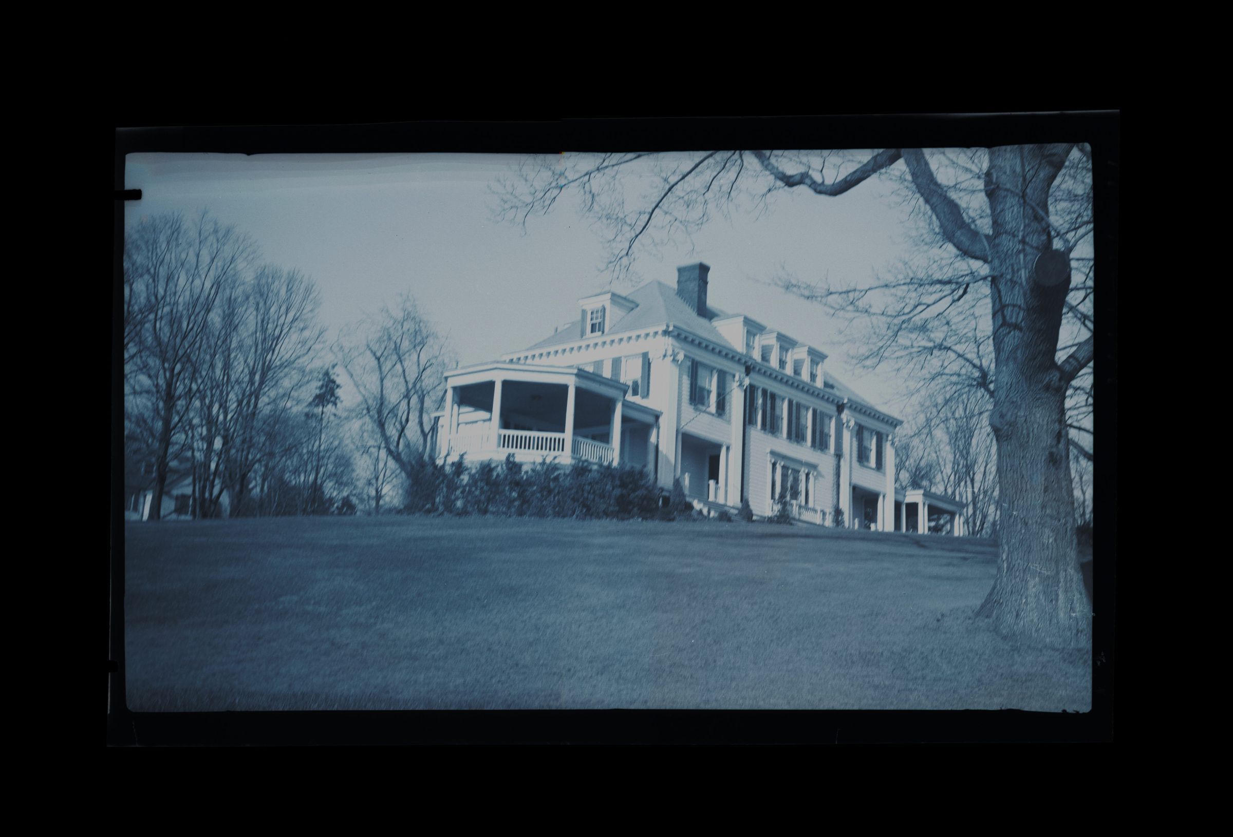A three story home with an octagonal porch on the side of the building