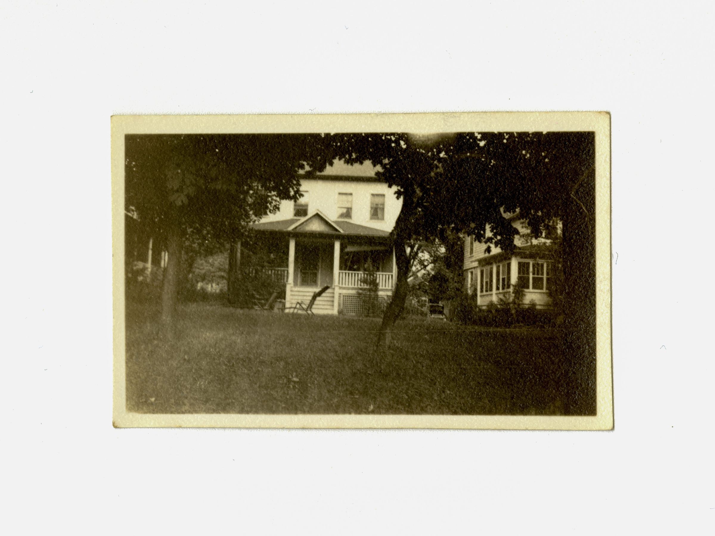 A view of the front porch of a home and its lawn. Another home is visible on the right of the image.