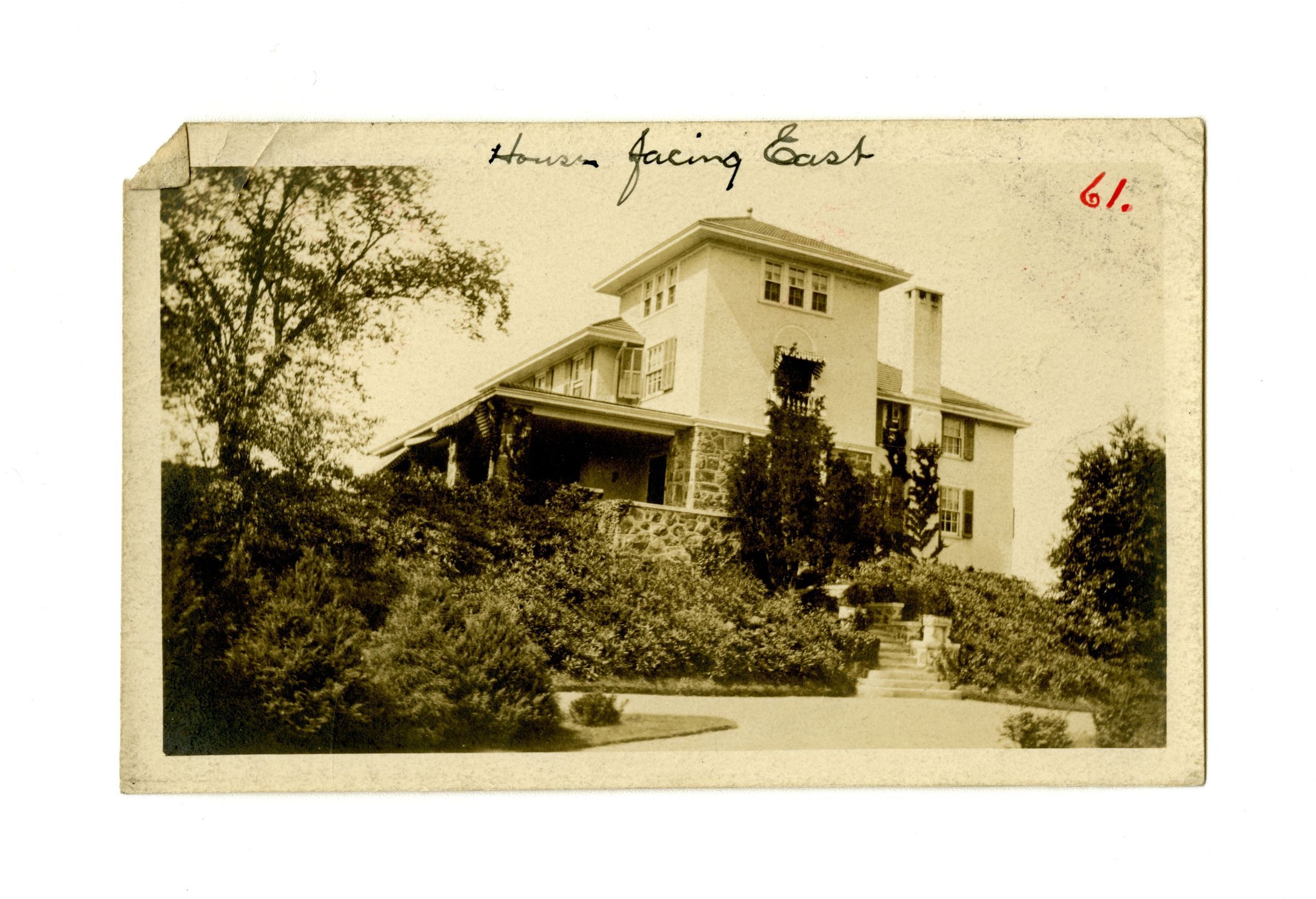 A view from the driveway of a Mediterranean-style house and the gardens leading up to the house.Collection