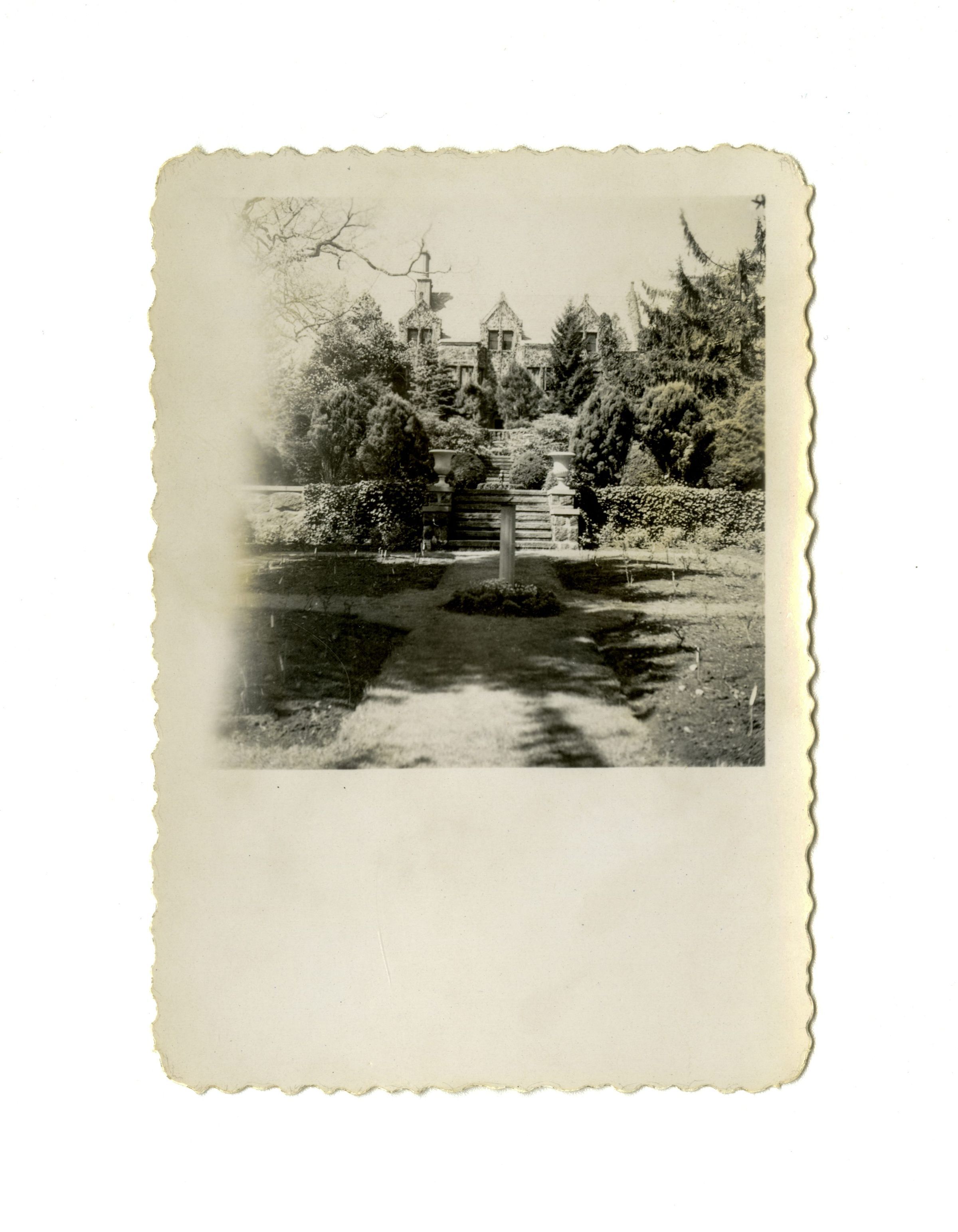 A path through the garden towards a set of stairs up to the house that can be seen in the background. The image is centered on a sundial in a intersection of garden paths.Collection