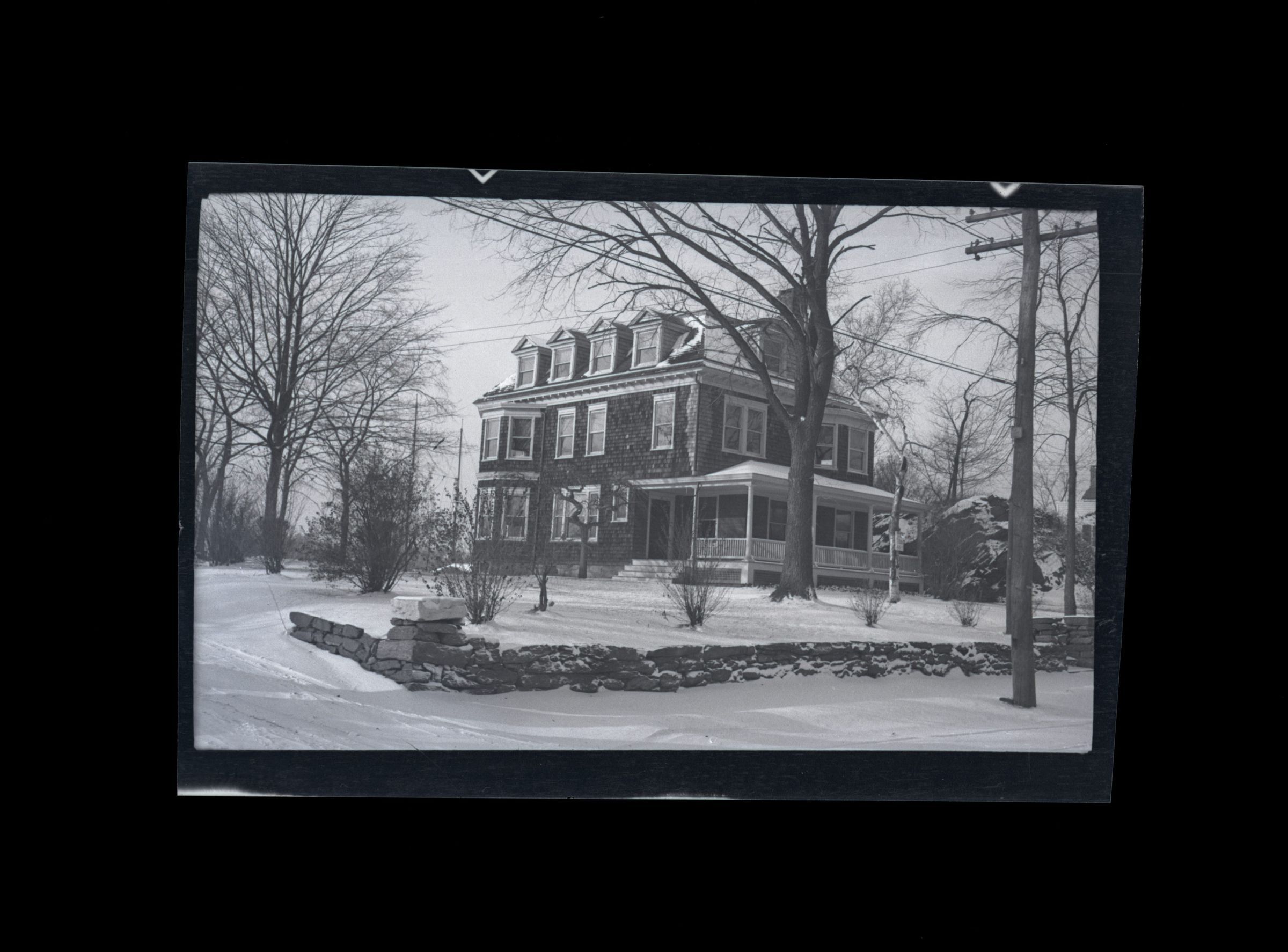 A three story shingle house with dormers in the snow.