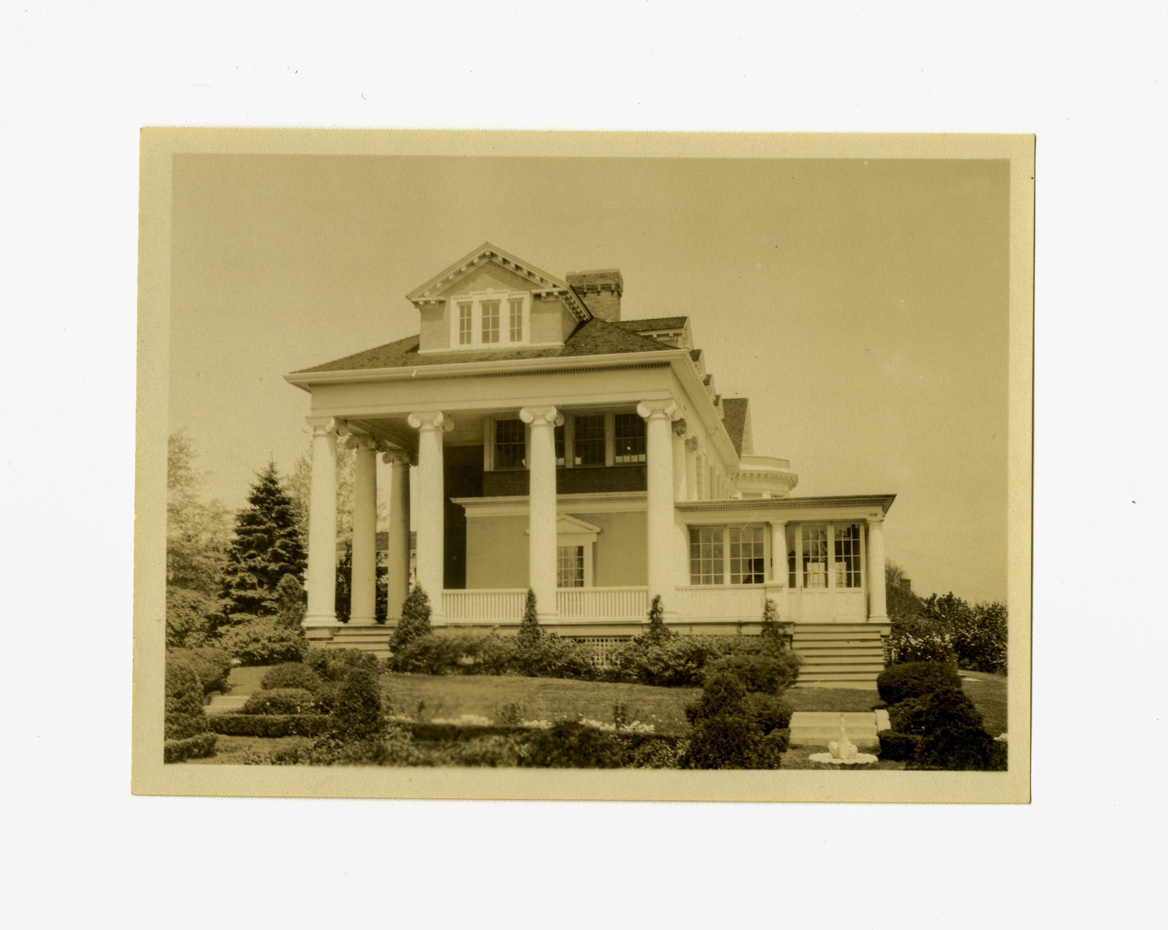 Side view of the mansion focusing on the distinctive two story side porch surrounding a one story side wing.Collection