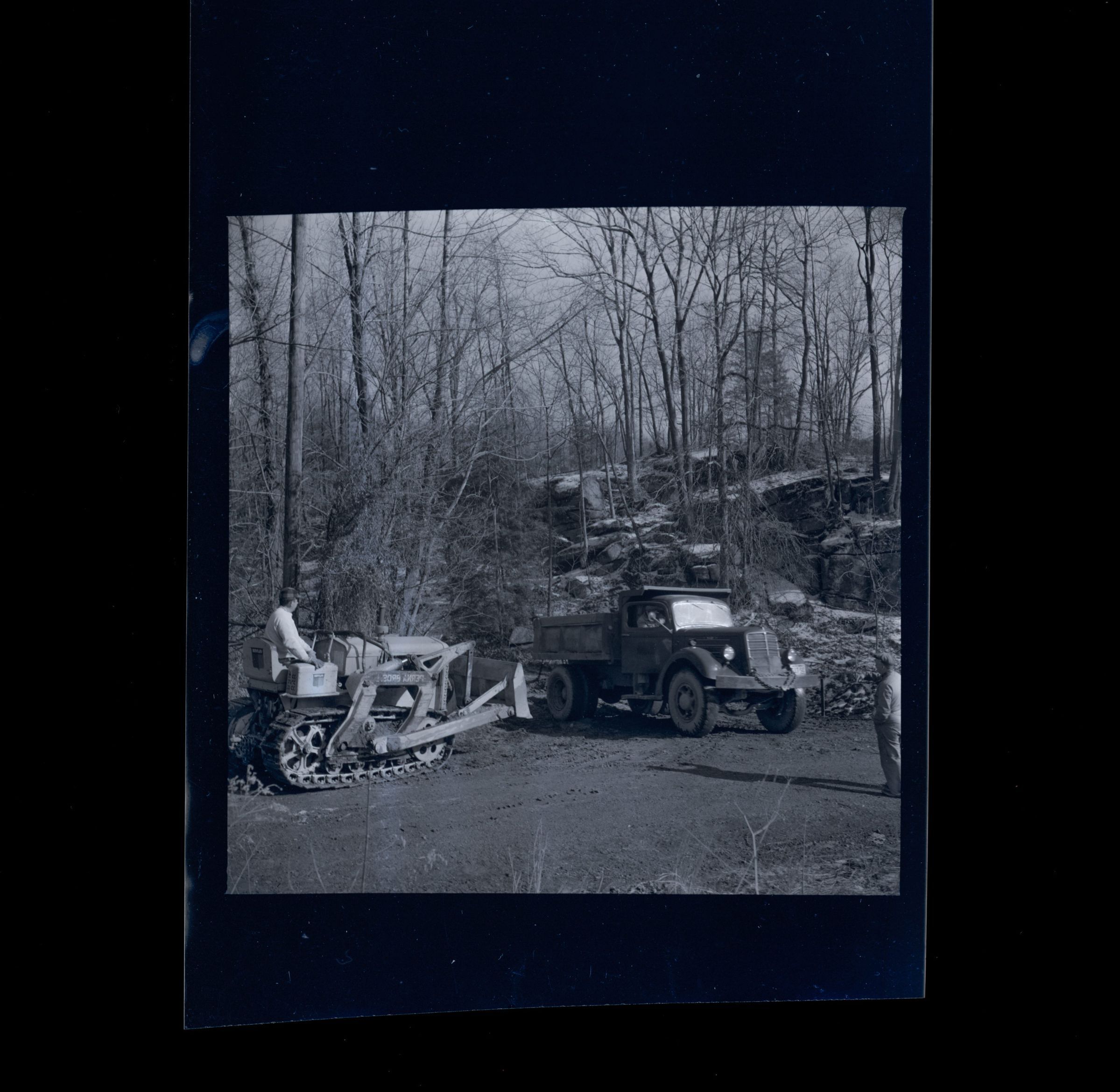 A man sitting on a small bulldozer with a pickup truck on the right of the image.Collection