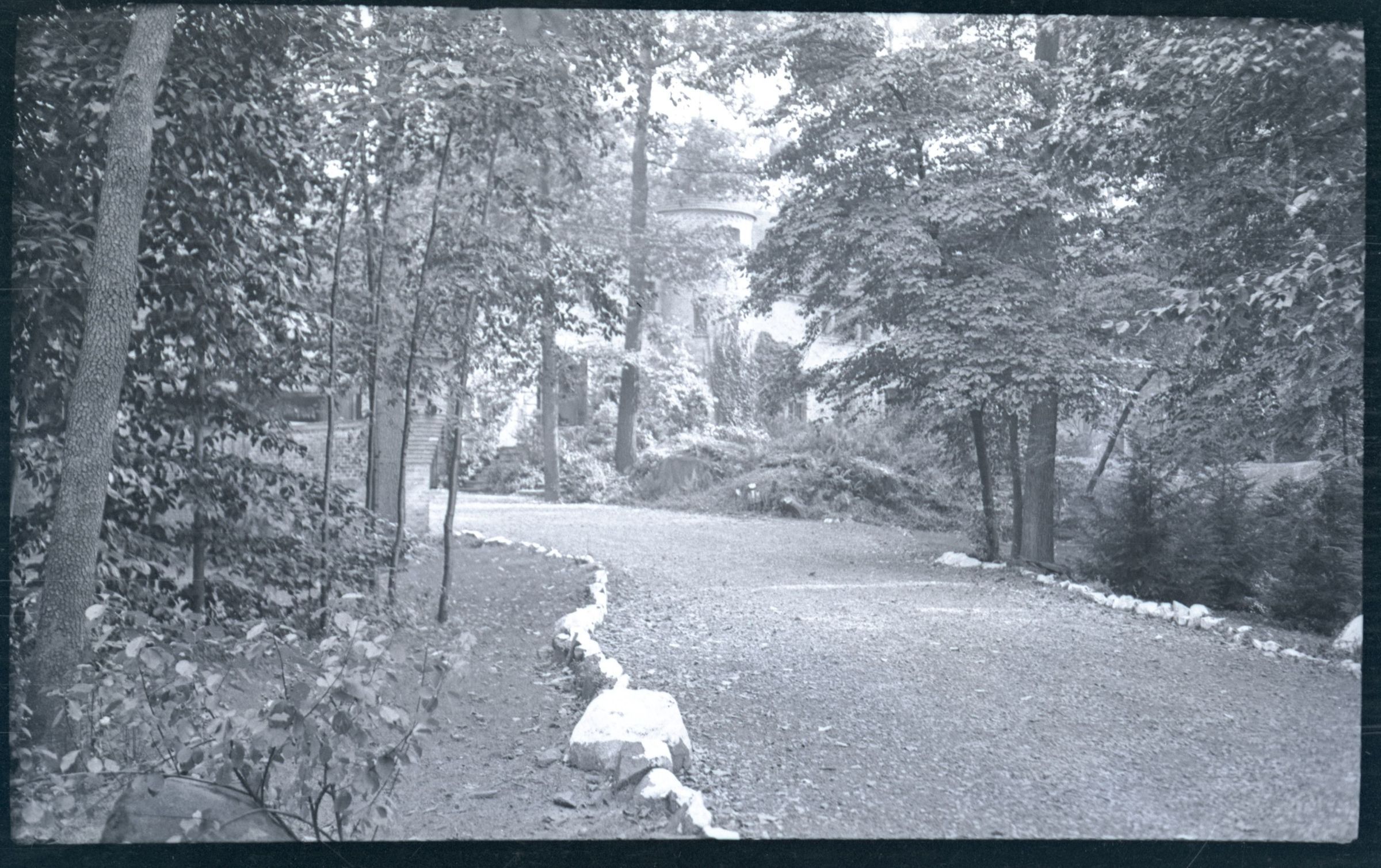 Part of the tree-lined driveway with a portion of the house visible in the background.Collection