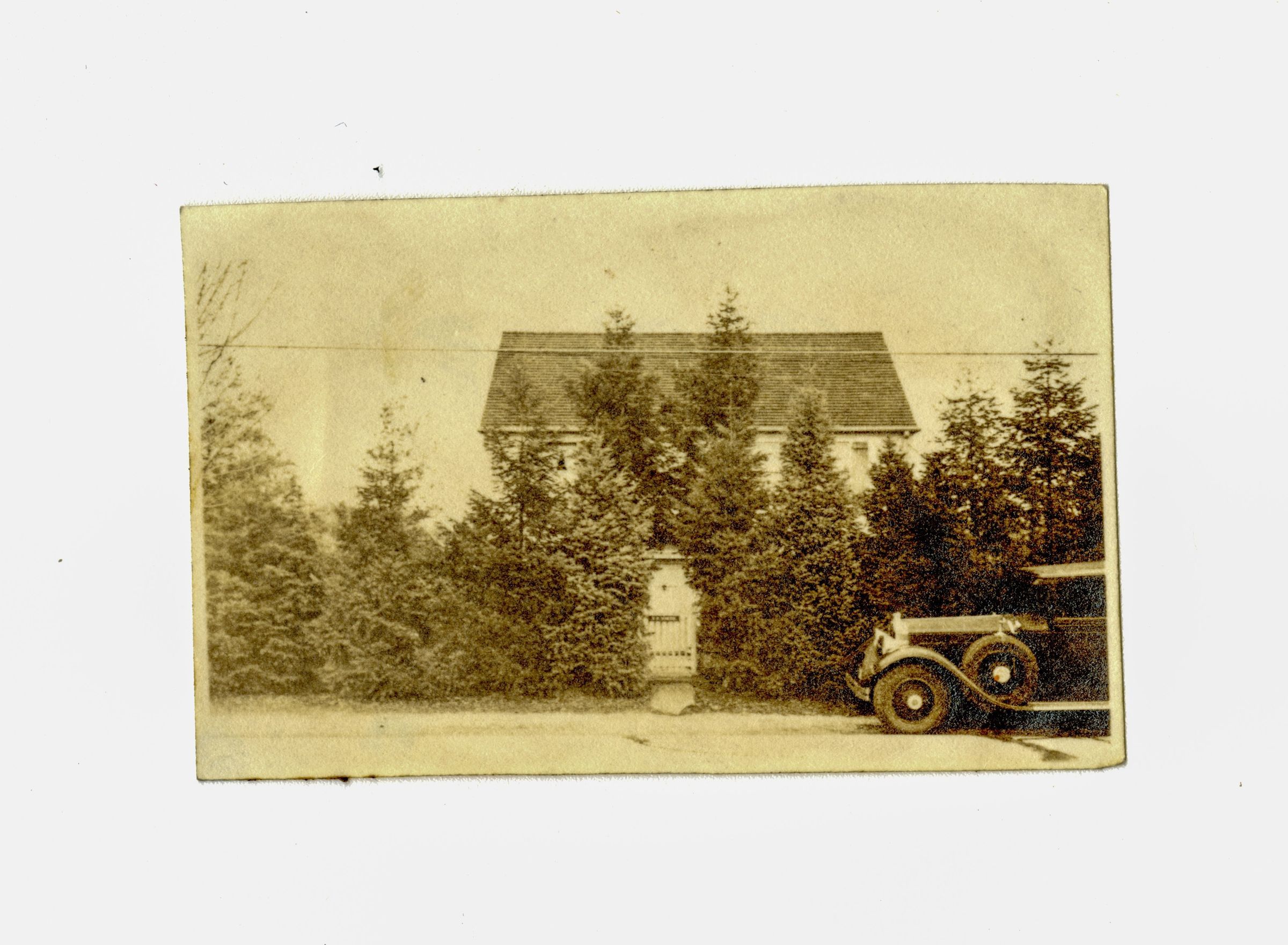 A house hidden by pine trees with a car parked in front of it.