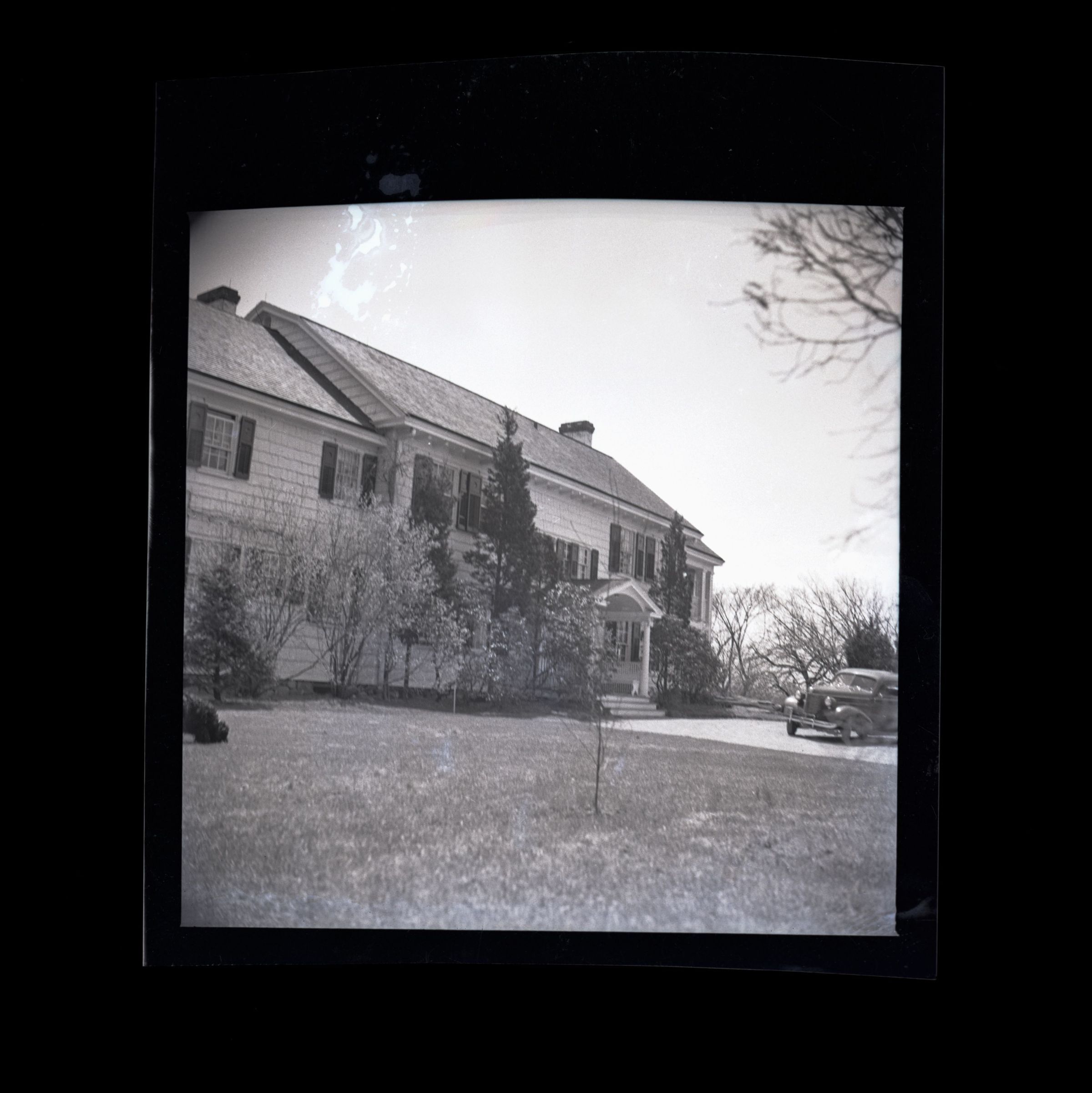 A two story shingle house with a car parked on its driveway in front of its entrance.Collection