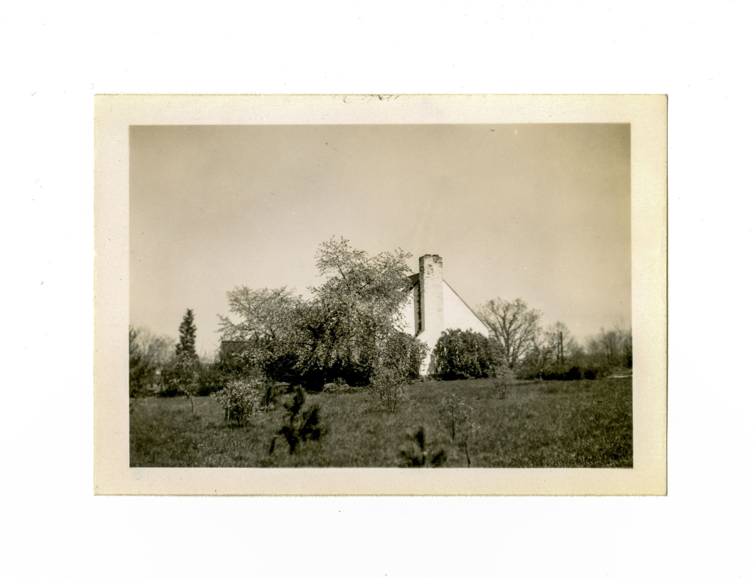 A view of the side of a two story home with its chimney, lawn, and gardens visible.Collection
