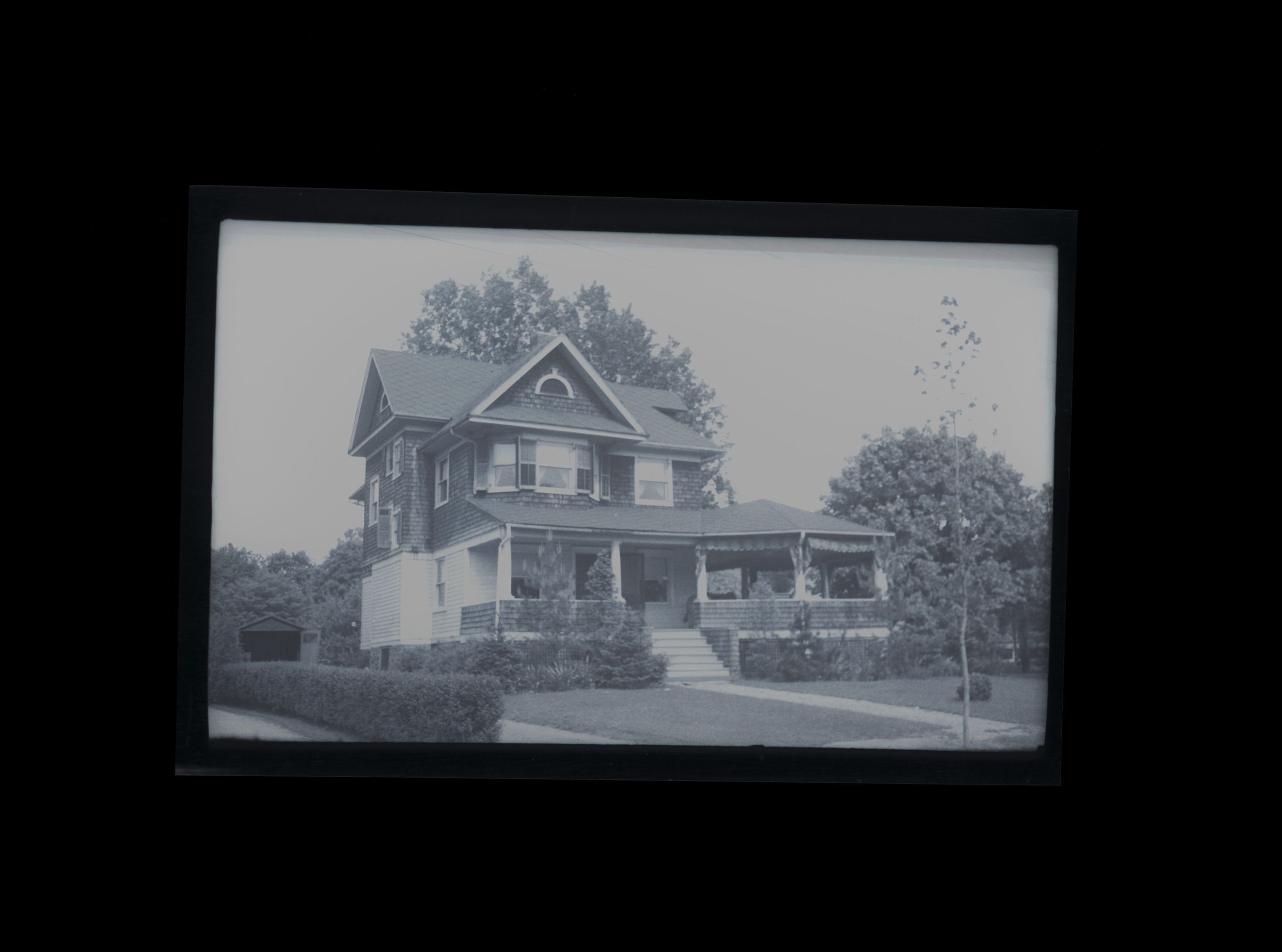 A three story shingle house with a full length porch that leads into a hexagonal space.