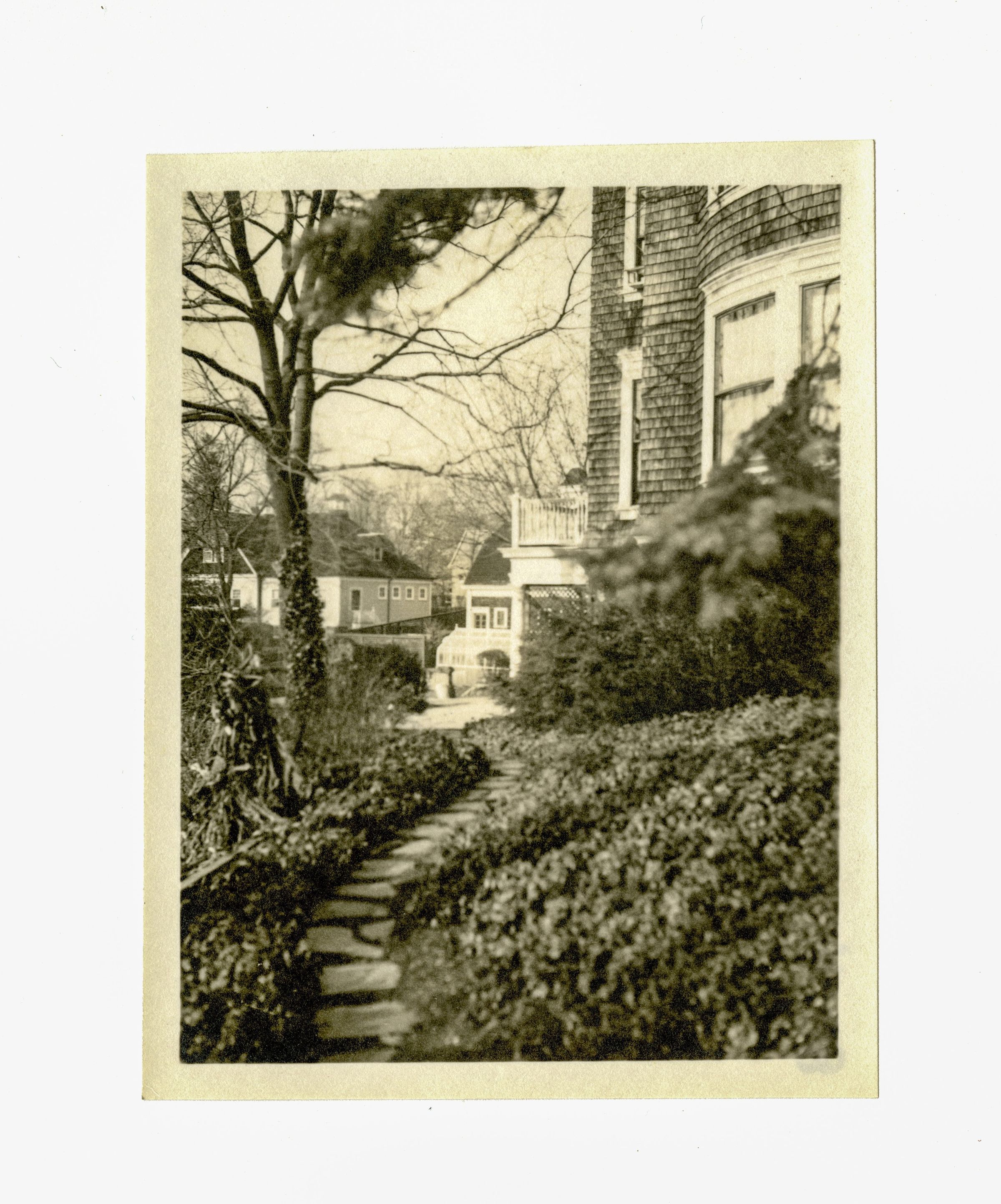 A view looking down the side of a shingle building and narrow garden path towards a number of other buildings on the property.Collection