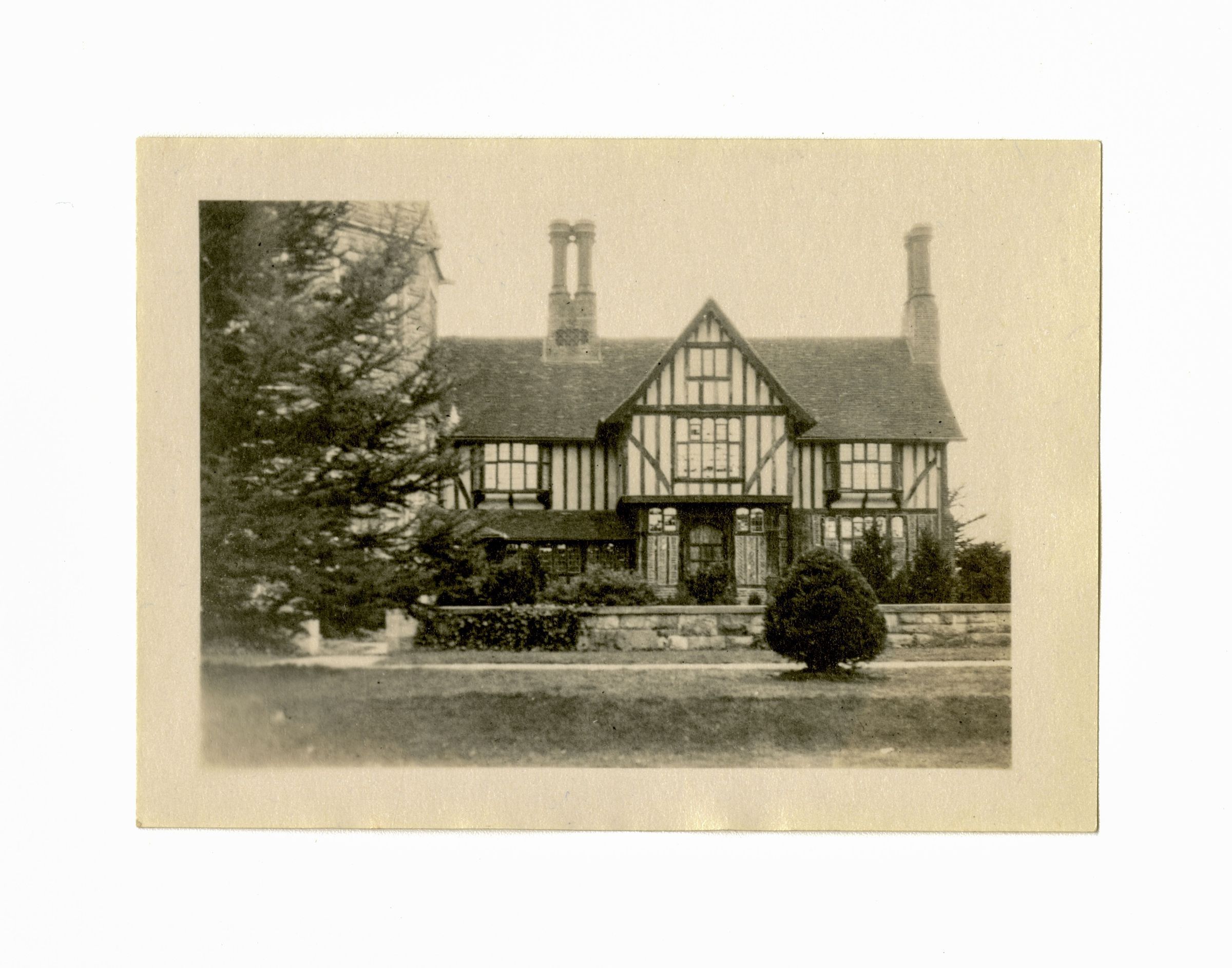 Part of the front face and an doorway of a three story Tudor-style house and part of its gardens.Collection