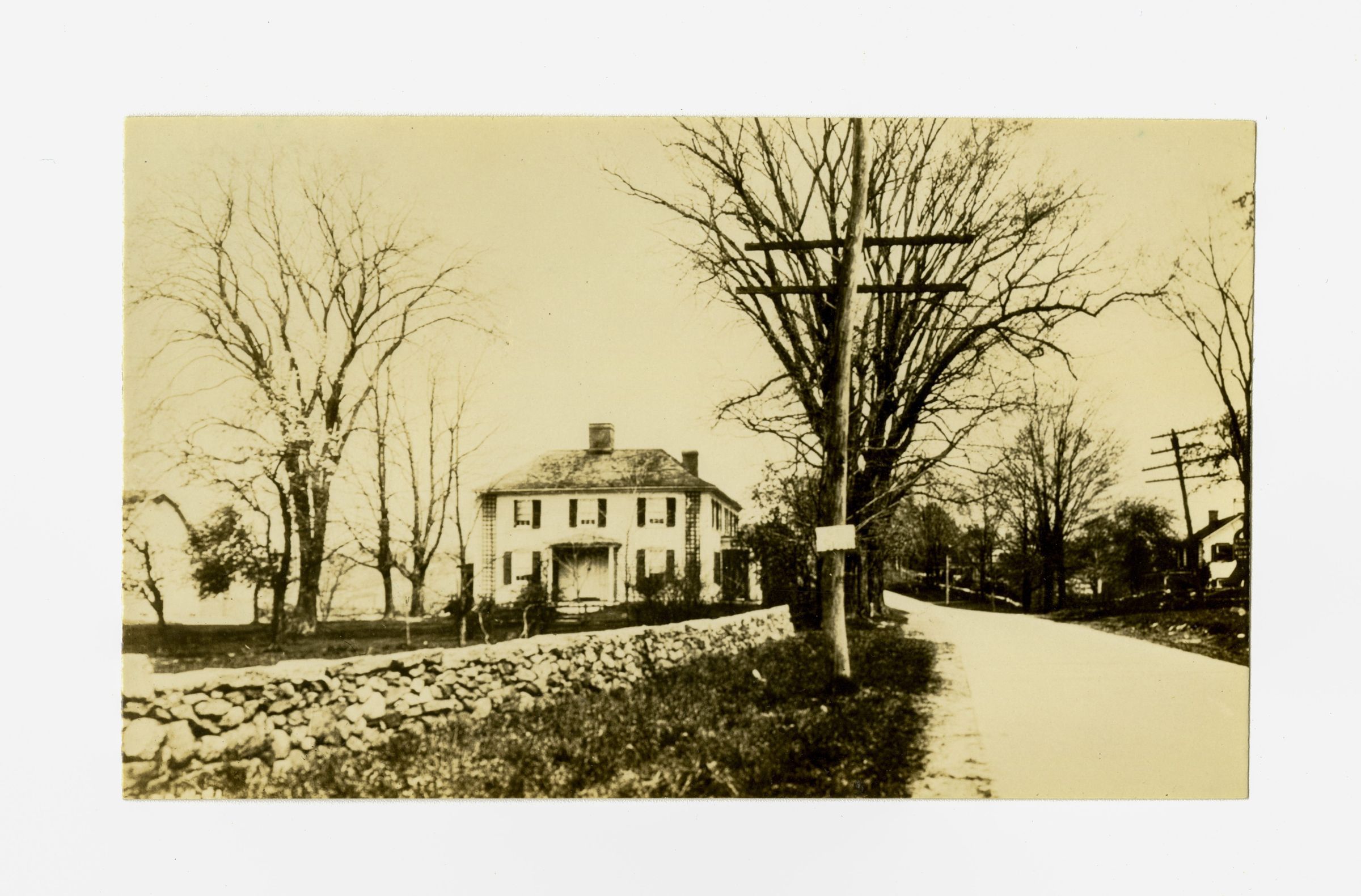 A view from the street looking towards a two story house. A stone wall on the left side of the image separates the property from the street.Collection