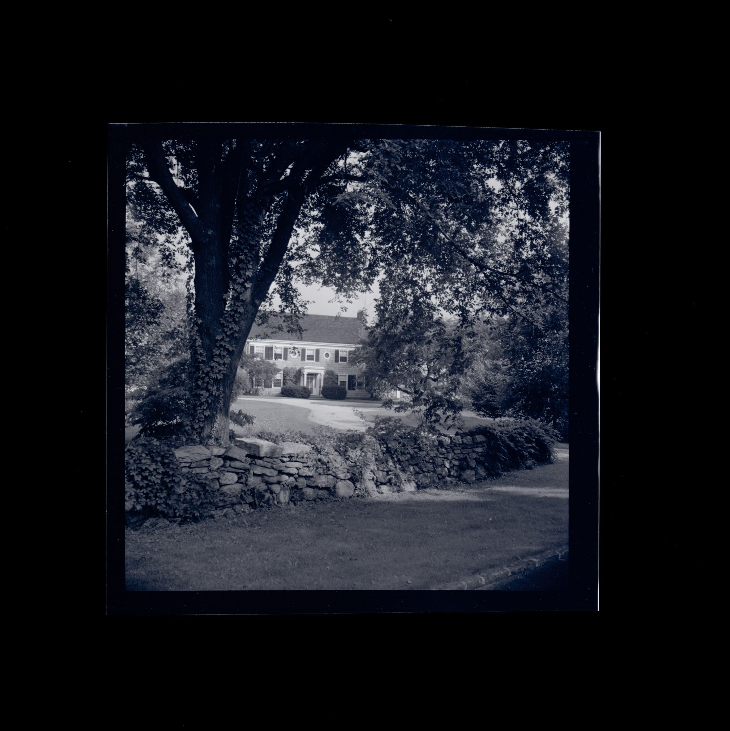 A view looking across across the lawn and driveway of a two story shingle house. A low stone wall is in the foreground of the image.Collection