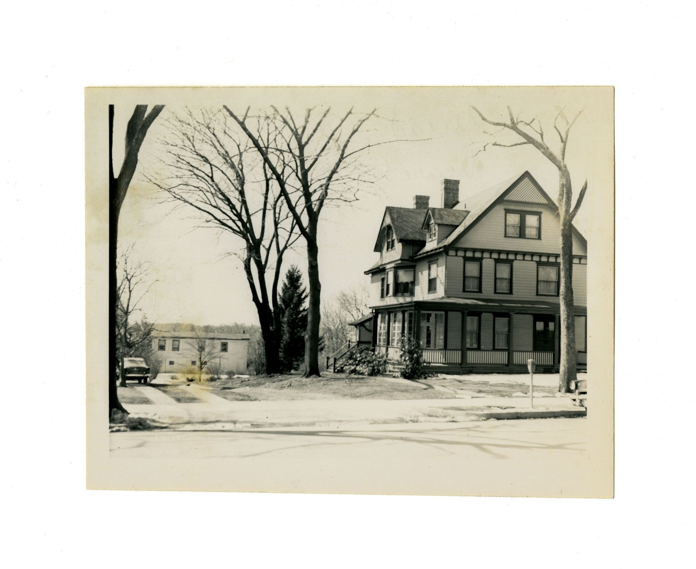 A three story home in the snow.