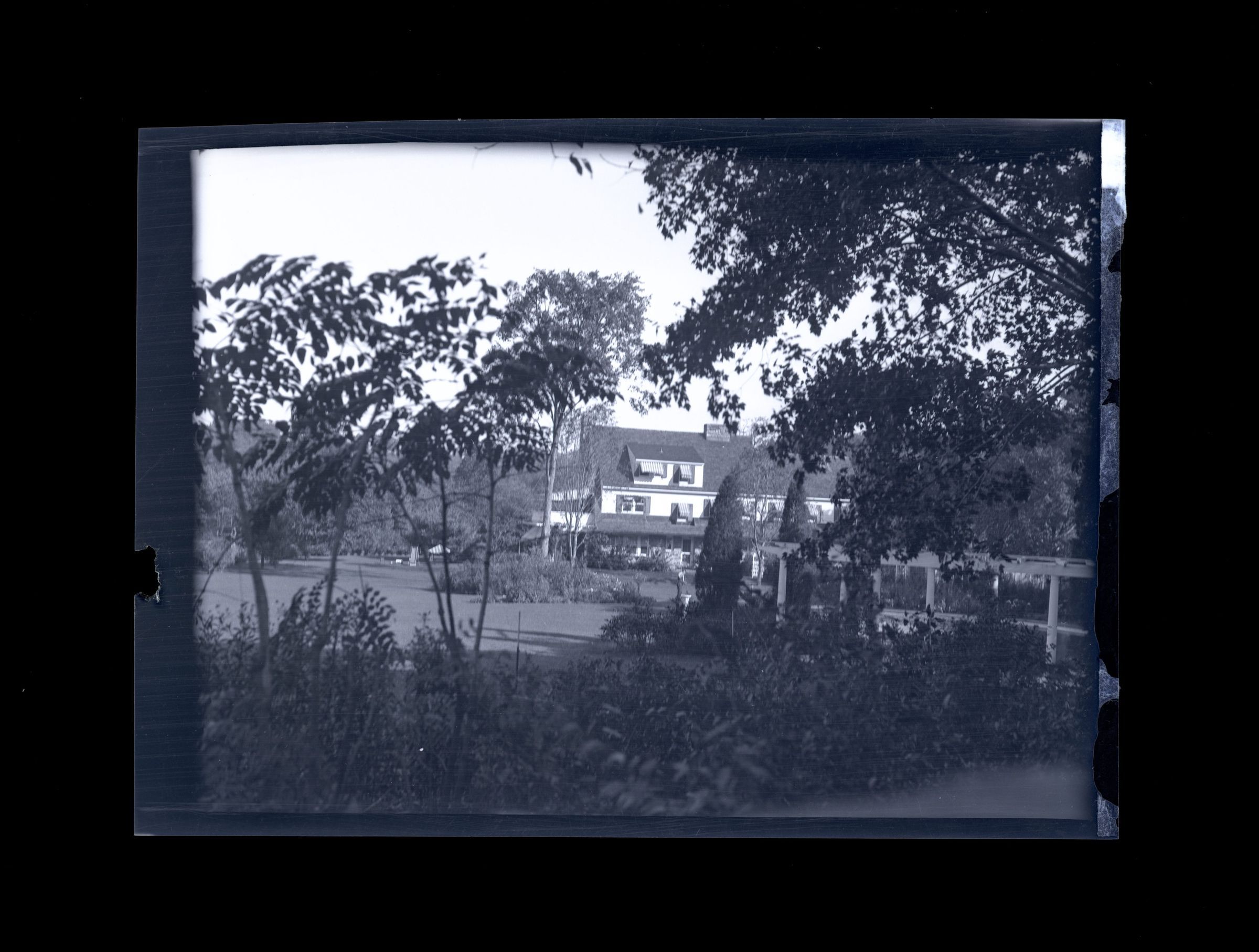 A view from the gardens looking across the lawn towards the back of a three story house.Collection