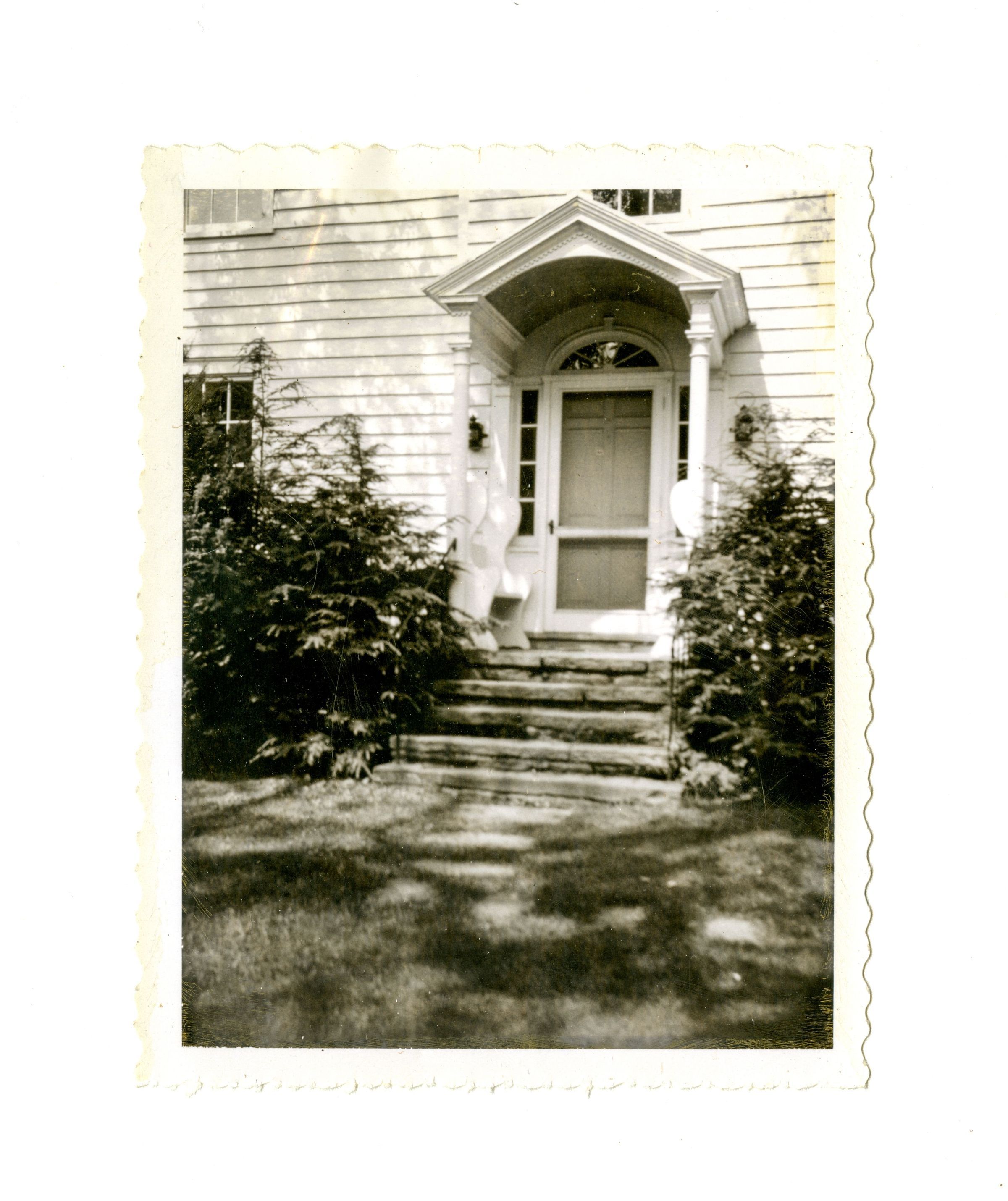 A door to a clapboard house with stone steps leading up to it and a portico over it.Collection